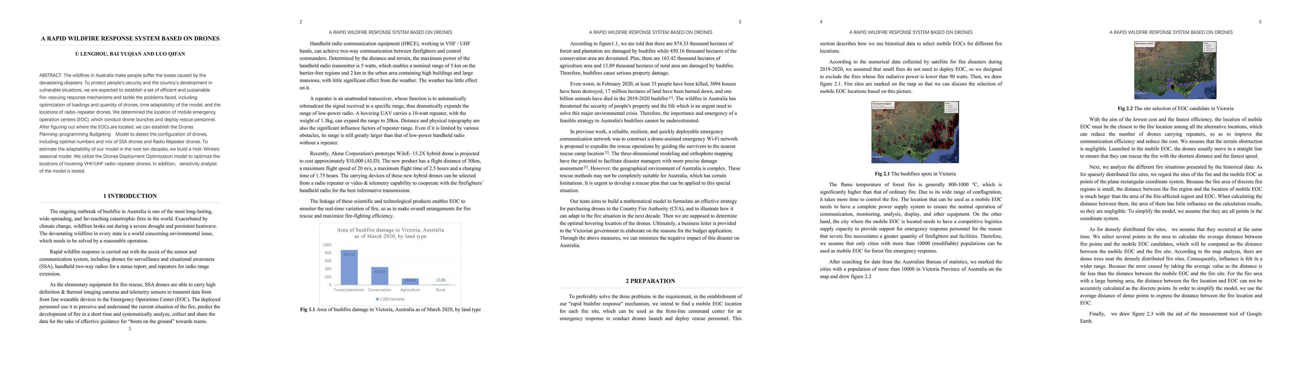 The wildfires in Australia make people suffer the losses caused by the devastating disasters. To protect people's security and the country's development in vulnerable situations, we are expected to establish a set of efficient and sustainable fire-rescuing response mechanisms and tackle the problems faced, including optimization of loadings and quantity of drones, time adaptability of the model, and the locations of radio-repeater drones. We determined the location of mobile emergency operation centers (EOC), which conduct drone launches and deploy rescue personnel. After figuring out where the EOCs are located, we can establish the Drones Planning-programming Budgeting Model to detect the configuration of drones, including optimal numbers and mix of SSA drones and Radio Repeater drones. To estimate the adaptability of our model in the next ten decades, we build a Holt-Winters seasonal model. We utilize the Drones Deployment Optimization model to optimize the locations of hovering VHF/UHF radio-repeater drones. In addition, sensitivity analysis of the model is tested.