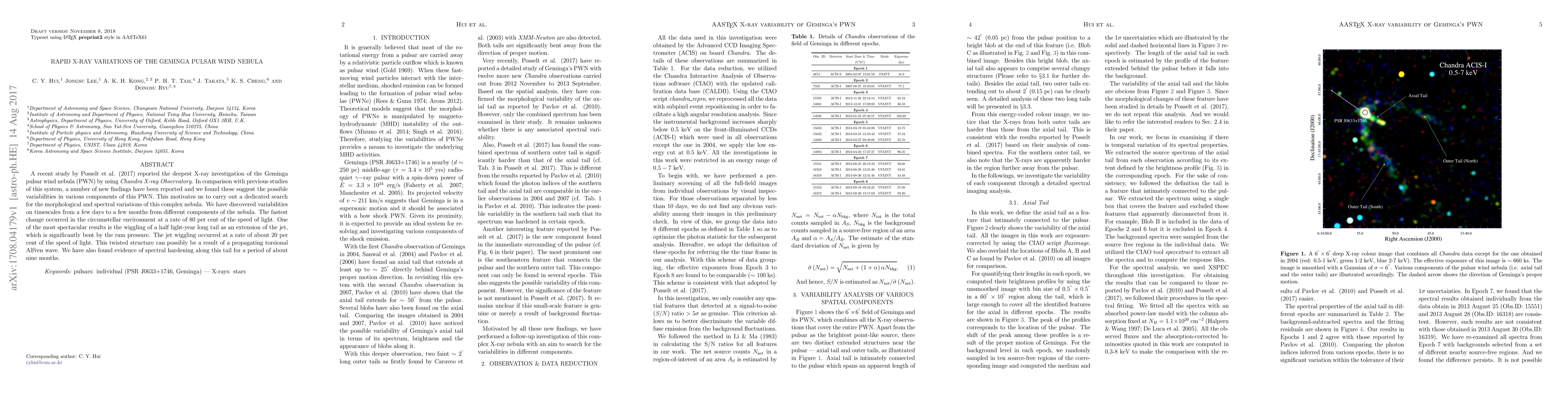 Posselt et al. (2017) utilized the \emph{Chandra X-ray Observatory} to detect rapid X-ray variations in the Geminga pulsar wind nebula, revealing significant morphological and spectral changes over days to months, including a twisting jet and spectral hardening.