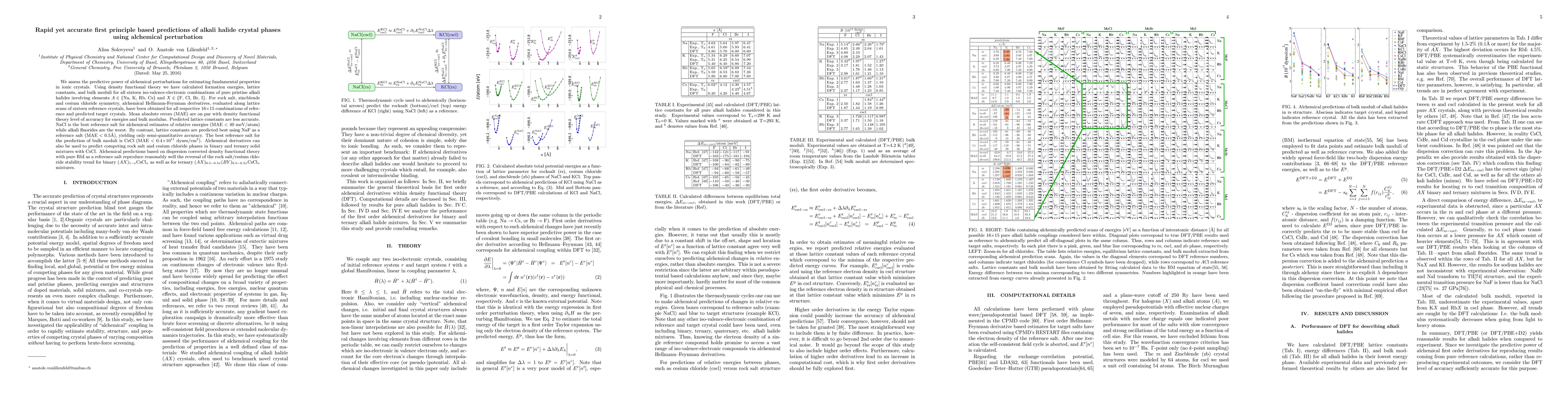 We assess the predictive power of alchemical perturbations for estimating fundamental properties in ionic crystals. Using density functional theory we have calculated formation energies, lattice constants, and bulk moduli for all sixteen iso-valence-electronic combinations of pure pristine alkali halides involving elements $A \in \{$Na, K, Rb, Cs$\}$ and $X \in \{$F, Cl, Br, I$\}$. For rock salt, zincblende and cesium chloride symmetry, alchemical Hellmann-Feynman derivatives, evaluated along lattice scans of sixteen reference crystals, have been obtained for all respective 16$\times$15 combinations of reference and predicted target crystals. Mean absolute errors (MAE) are on par with density functional theory level of accuracy for energies and bulk modulus. Predicted lattice constants are less accurate. NaCl is the best reference salt for alchemical estimates of relative energies (MAE $<$ 40 meV/atom) while alkali fluorides are the worst. By contrast, lattice constants are predicted best using NaF as a reference salt (MAE $<$ 0.5{\AA}), yielding only semi-quantitative accuracy. The best reference salt for the prediction of bulk moduli is CsCl (MAE $<$ 0.4$\times$10$^{11}$ dynes/cm$^2$). Alchemical derivatives can also be used to predict competing rock salt and cesium chloride phases in binary and ternary solid mixtures with CsCl. Alchemical predictions based on dispersion corrected density functional theory with pure RbI as a reference salt reproduce reasonably well the reversal of the rock salt/cesium chloride stability trend for binary $(AX)_{1-x}$CsCl$_x$ as well as for ternary $(AX)_{0.5-0.5x}(BY)_{0.5-0.5x}$CsCl$_x$ mixtures.