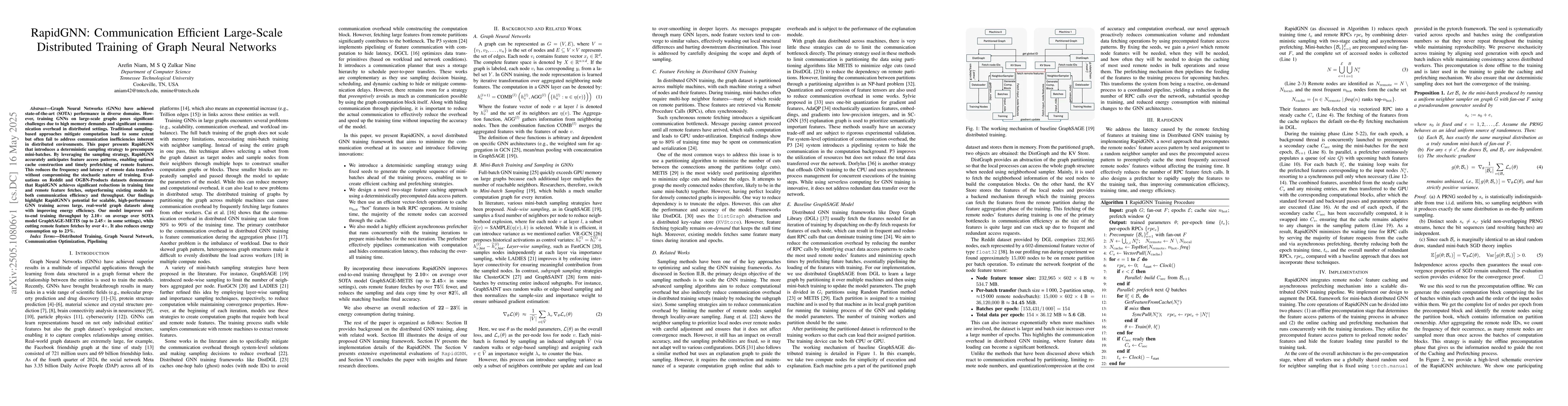 Graph Neural Networks (GNNs) have achieved state-of-the-art (SOTA) performance in diverse domains. However, training GNNs on large-scale graphs poses significant challenges due to high memory demands and significant communication overhead in distributed settings. Traditional sampling-based approaches mitigate computation load to some extent but often fail to address communication inefficiencies inherent in distributed environments. This paper presents RapidGNN that introduces a deterministic sampling strategy to precompute mini-batches. By leveraging the sampling strategy, RapidGNN accurately anticipates feature access patterns, enabling optimal cache construction and timely prefetching of remote features. This reduces the frequency and latency of remote data transfers without compromising the stochastic nature of training. Evaluations on Reddit and OGBN-Products datasets demonstrate that RapidGNN achieves significant reductions in training time and remote feature fetches, outperforming existing models in both communication efficiency and throughput. Our findings highlight RapidGNN's potential for scalable, high-performance GNN training across large, real-world graph datasets along with improving energy efficiency. Our model improves end-to-end training throughput by 2.10x on average over SOTA model GraphSAGE-METIS (up to 2.45x in some settings), while cutting remote feature fetches by over 4x. It also reduces energy consumption up to 23%.
