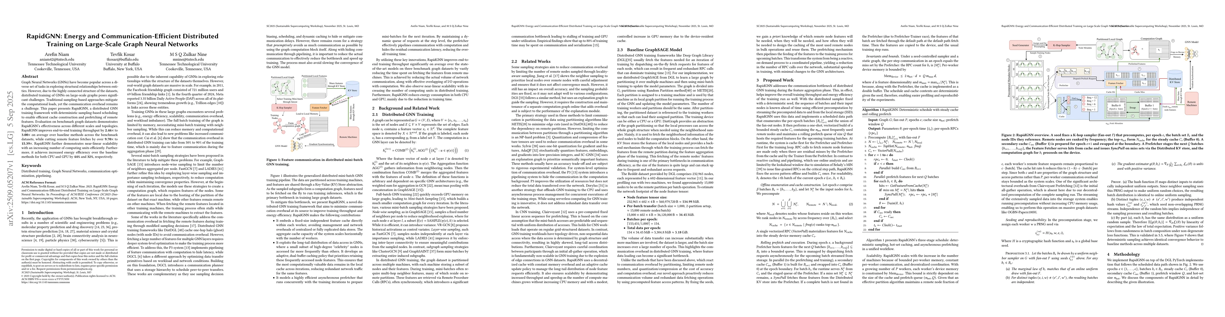 Graph Neural Networks (GNNs) have become popular across a diverse set of tasks in exploring structural relationships between entities. However, due to the highly connected structure of the datasets, distributed training of GNNs on large-scale graphs poses significant challenges. Traditional sampling-based approaches mitigate the computational loads, yet the communication overhead remains a challenge. This paper presents RapidGNN, a distributed GNN training framework with deterministic sampling-based scheduling to enable efficient cache construction and prefetching of remote features. Evaluation on benchmark graph datasets demonstrates RapidGNN's effectiveness across different scales and topologies. RapidGNN improves end-to-end training throughput by 2.46x to 3.00x on average over baseline methods across the benchmark datasets, while cutting remote feature fetches by over 9.70x to 15.39x. RapidGNN further demonstrates near-linear scalability with an increasing number of computing units efficiently. Furthermore, it achieves increased energy efficiency over the baseline methods for both CPU and GPU by 44% and 32%, respectively.