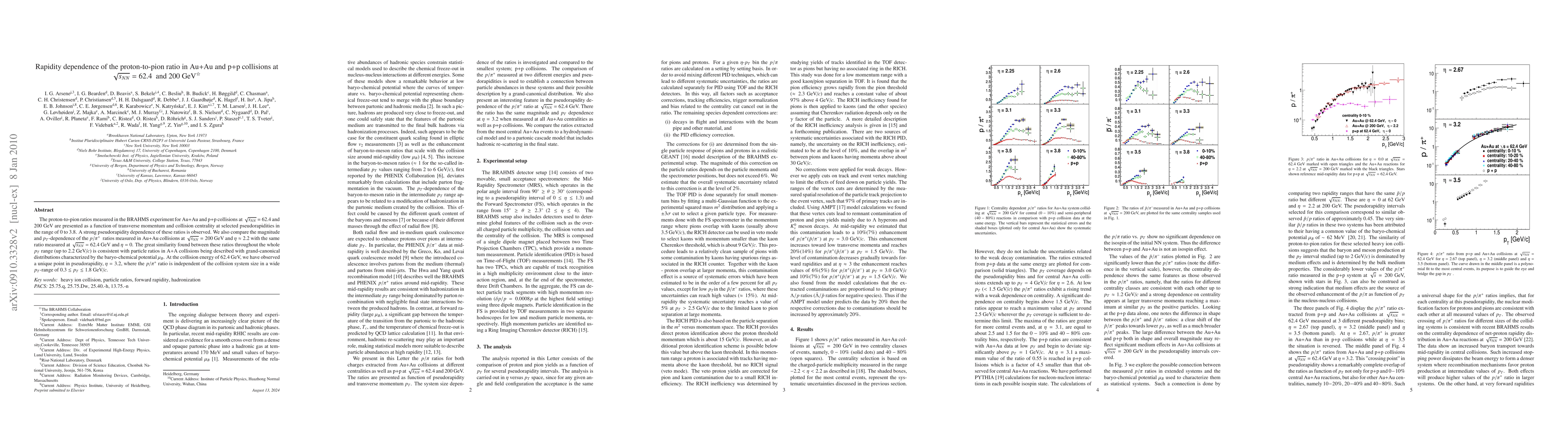 The BRAHMS experiment reports proton-to-pion ratios in Au+Au and p+p collisions at 62.4 and 200 GeV, showing strong pseudorapidity dependence and a unique point at $\eta = 3.2$ where the ratio is independent of collision system size. The similarity in ratios across different energies supports grand-canonical distributions characterized by the baryo-chemical potential.