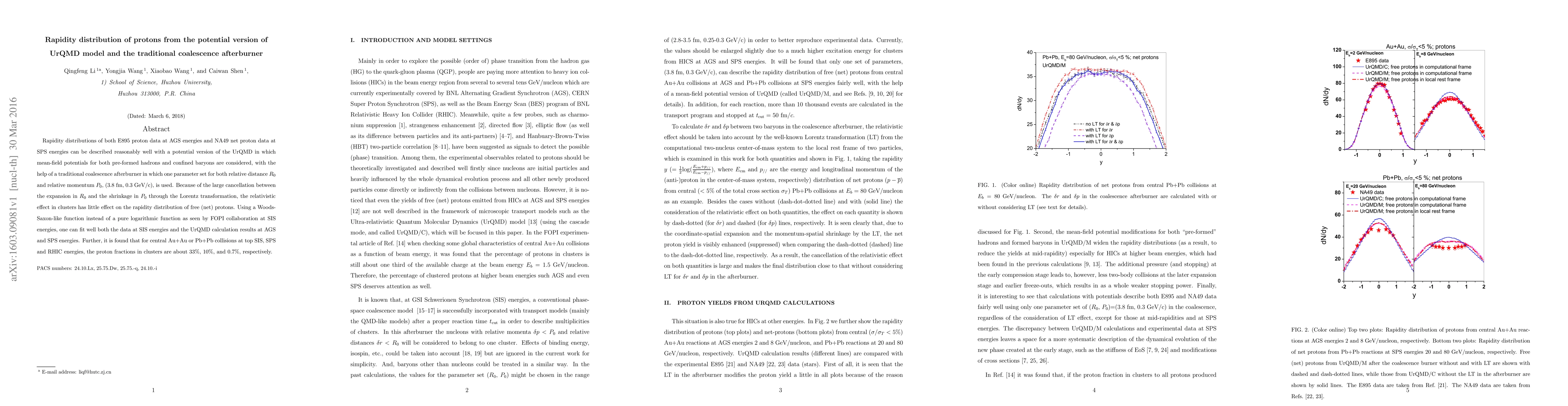 Rapidity distributions of both E895 proton data at AGS energies and NA49 net proton data at SPS energies can be described reasonably well with a potential version of the UrQMD in which mean-field potentials for both pre-formed hadrons and confined baryons are considered, with the help of a traditional coalescence afterburner in which one parameter set for both relative distance $R_0$ and relative momentum $P_0$, (3.8 fm, 0.3 GeV$/$c), is used. Because of the large cancellation between the expansion in $R_0$ and the shrinkage in $P_0$ through the Lorentz transformation, the relativistic effect in clusters has little effect on the rapidity distribution of free (net) protons. Using a Woods-Saxon-like function instead of a pure logarithmic function as seen by FOPI collaboration at SIS energies, one can fit well both the data at SIS energies and the UrQMD calculation results at AGS and SPS energies. Further, it is found that for central Au+Au or Pb+Pb collisions at top SIS, SPS and RHIC energies, the proton fractions in clusters are about 33$\%$, 10$\%$, and 0.7$\%$, respectively.