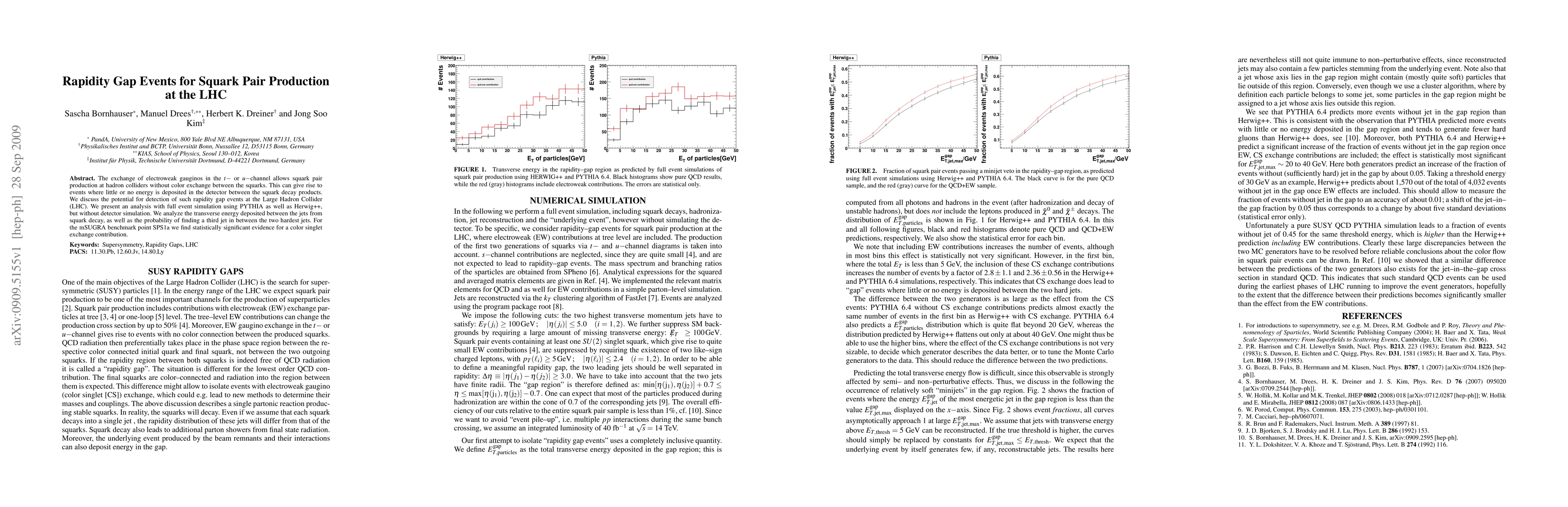 The exchange of electroweak gauginos in the $t-$ or $u-$channel allows squark pair production at hadron colliders without color exchange between the squarks. This can give rise to events where little or no energy is deposited in the detector between the squark decay products. We discuss the potential for detection of such rapidity gap events at the Large Hadron Collider (LHC). We present an analysis with full event simulation using PYTHIA as well as Herwig++, but without detector simulation. We analyze the transverse energy deposited between the jets from squark decay, as well as the probability of finding a third jet in between the two hardest jets. For the mSUGRA benchmark point SPS1a we find statistically significant evidence for a color singlet exchange contribution.