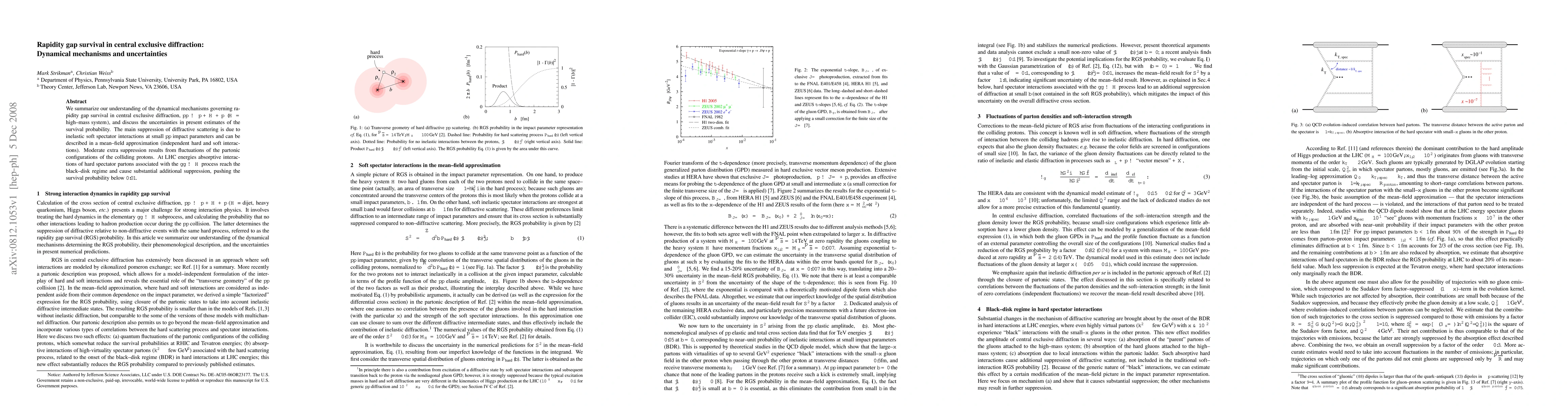 We summarize our understanding of the dynamical mechanisms governing rapidity gap survival in central exclusive diffraction, pp -> p + H + p (H = high-mass system), and discuss the uncertainties in present estimates of the survival probability. The main suppression of diffractive scattering is due to inelastic soft spectator interactions at small pp impact parameters and can be described in a mean-field approximation (independent hard and soft interactions). Moderate extra suppression results from fluctuations of the partonic configurations of the colliding protons. At LHC energies absorptive interactions of hard spectator partons associated with the gg -> H process reach the black-disk regime and cause substantial additional suppression, pushing the survival probability below 0.01.