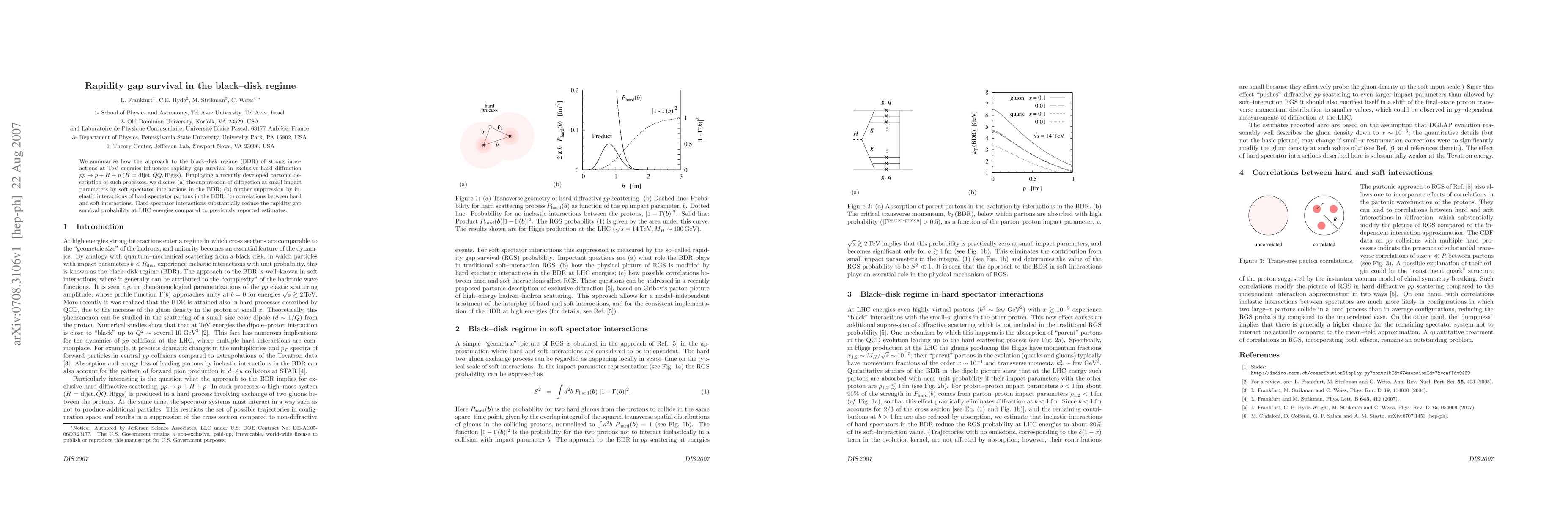 We summarize how the approach to the black-disk regime (BDR) of strong interactions at TeV energies influences rapidity gap survival in exclusive hard diffraction pp -> p + H + p (H = dijet, Qbar-Q, Higgs). Employing a recently developed partonic description of such processes, we discuss (a) the suppression of diffraction at small impact parameters by soft spectator interactions in the BDR; (b) further suppression by inelastic interactions of hard spectator partons in the BDR; (c) correlations between hard and soft interactions. Hard spectator interactions substantially reduce the rapidity gap survival probability at LHC energies compared to previously reported estimates.