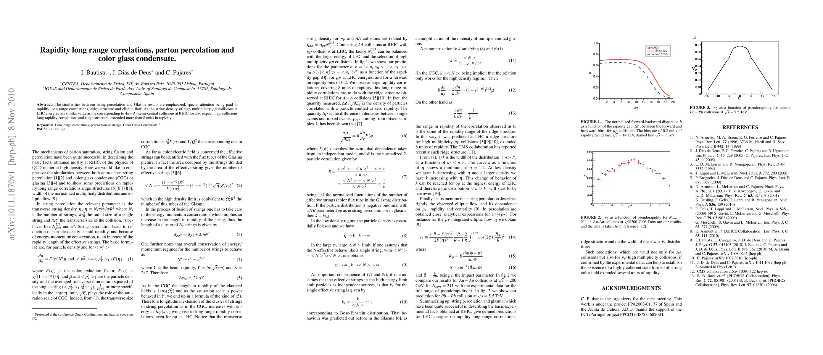 The similarities between string percolation and Glasma results are emphasized, special attention being paid to rapidity long range correlations, ridge structure and elliptic flow. As the string density of high multiplicity pp collisions at LHC energies has similar value as the corresponding to Au-Au semi-central collisions at RHIC we also expect in pp collisions long rapidity correlations and ridge structure, extended more than 8 units in rapidity.