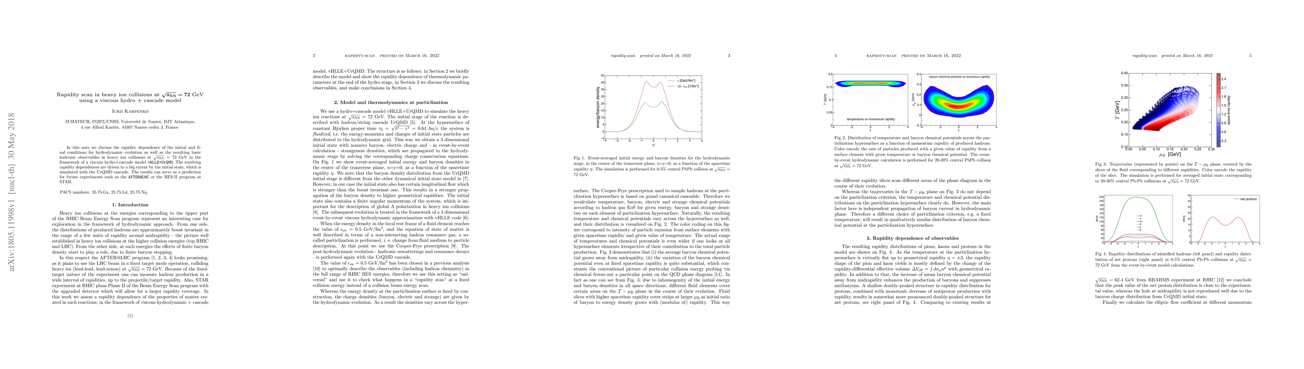 In this note we discuss the rapidity dependence of the initial and final conditions for hydrodynamic evolution as well as the resulting basic hadronic observables in heavy ion collisions at $\sqrt{s_{\rm NN}}=72$ GeV in the framework of a viscous hydro+cascade model vHLLE+UrQMD. The resulting rapidity dependences are driven to a big extent by the initial state, which is simulated with the UrQMD cascade. The results can serve as a prediction for future experiments such as the AFTER@LHC or the BES-II program at STAR.