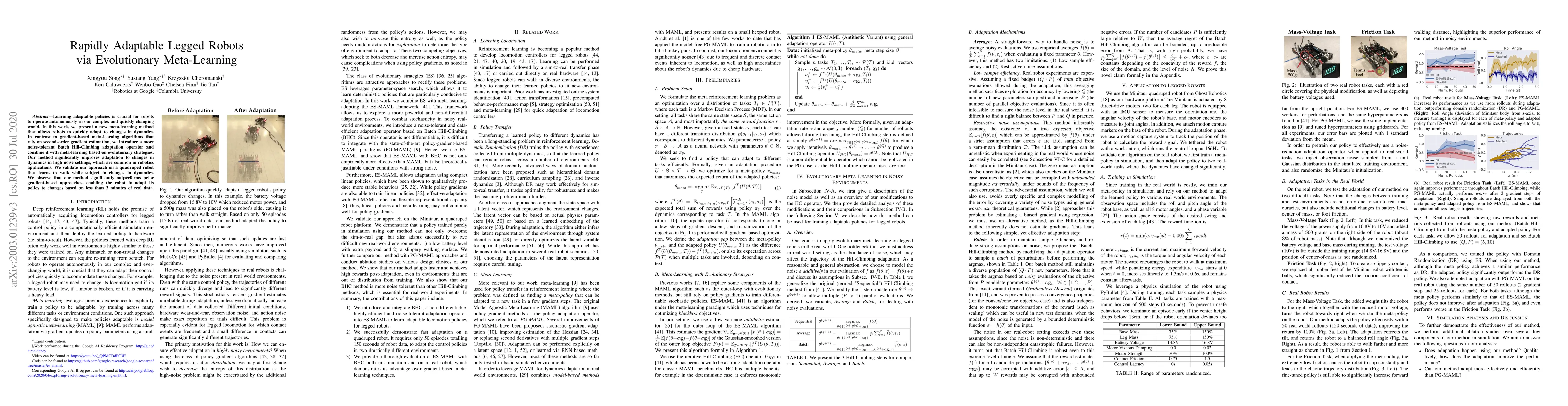 This paper introduces a novel meta-learning method combining evolutionary strategies with a noise-tolerant Batch Hill-Climbing adaptation operator to enable legged robots to rapidly adapt to dynamic changes. The approach outperforms gradient-based methods, allowing a quadruped robot to learn to walk under dynamic shifts with minimal real-world data.