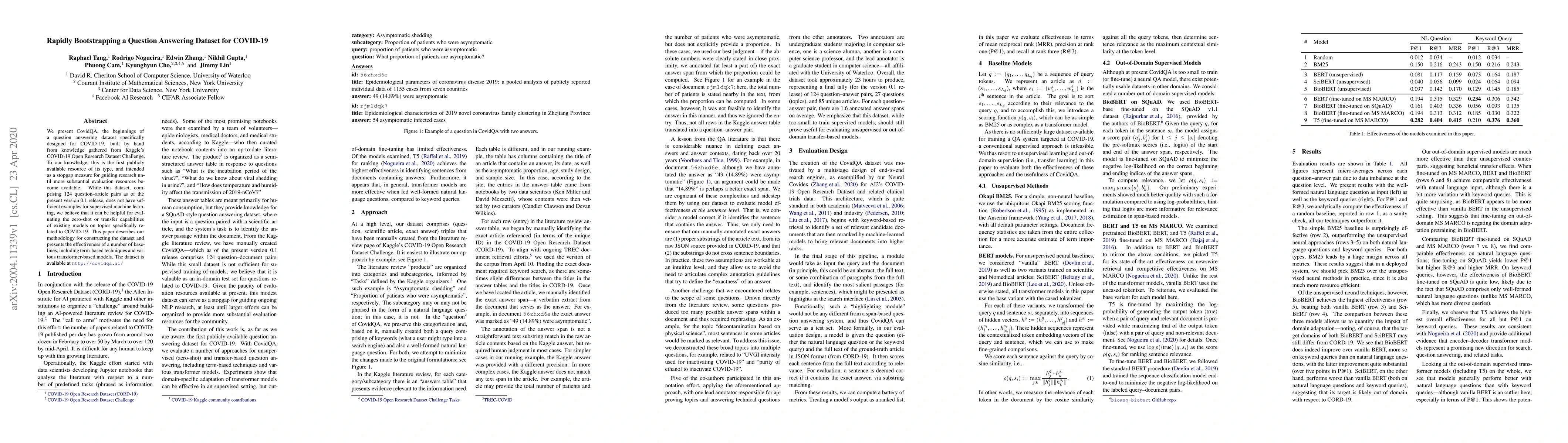 We present CovidQA, the beginnings of a question answering dataset specifically designed for COVID-19, built by hand from knowledge gathered from Kaggle's COVID-19 Open Research Dataset Challenge. To our knowledge, this is the first publicly available resource of its type, and intended as a stopgap measure for guiding research until more substantial evaluation resources become available. While this dataset, comprising 124 question-article pairs as of the present version 0.1 release, does not have sufficient examples for supervised machine learning, we believe that it can be helpful for evaluating the zero-shot or transfer capabilities of existing models on topics specifically related to COVID-19. This paper describes our methodology for constructing the dataset and presents the effectiveness of a number of baselines, including term-based techniques and various transformer-based models. The dataset is available at http://covidqa.ai/