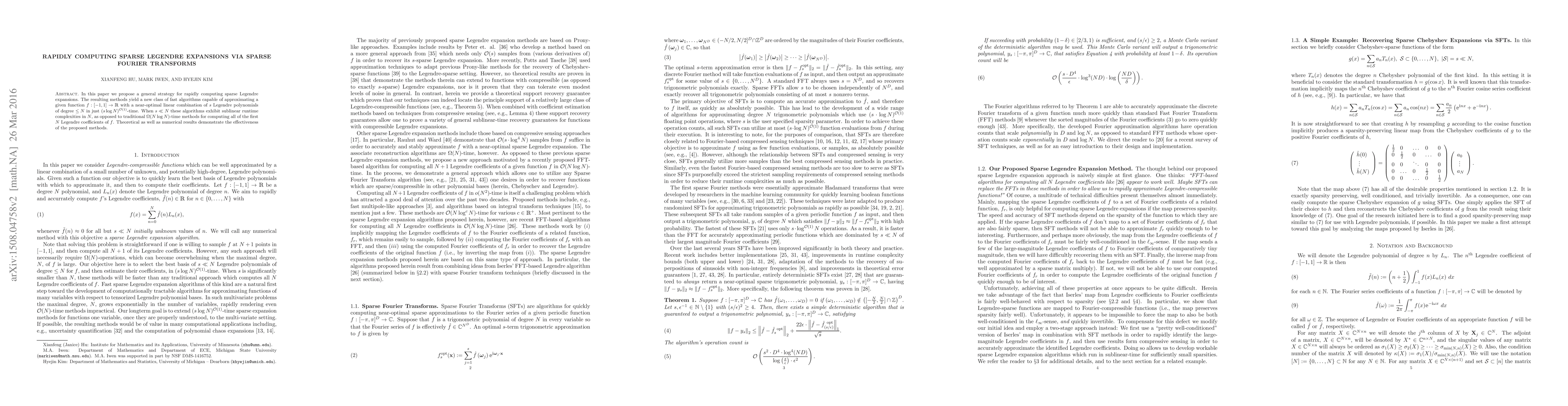 This paper proposes a novel strategy for efficiently computing sparse Legendre expansions using sparse Fourier transforms, achieving sublinear time complexity in $N$ compared to traditional methods, and demonstrating near-optimal performance through theoretical and numerical analysis.