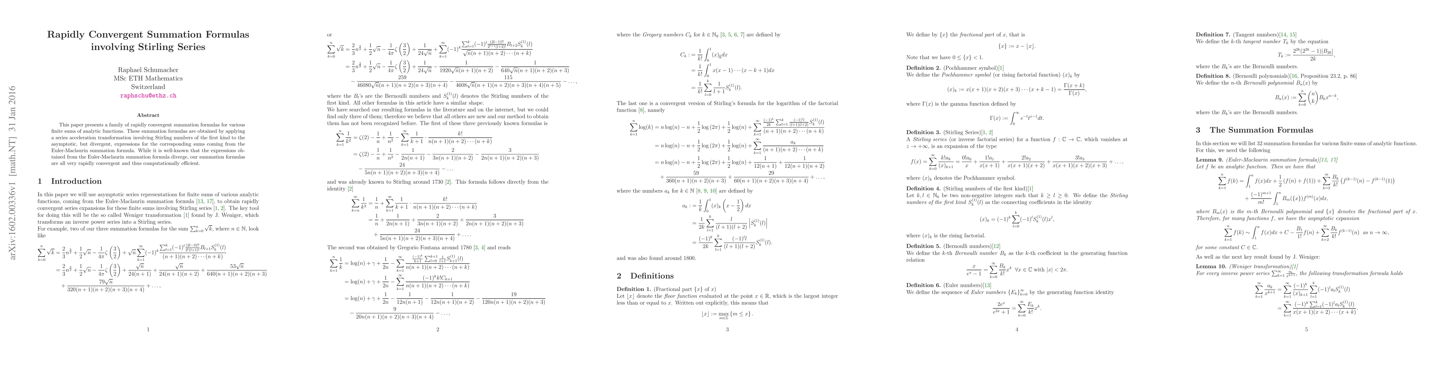 This paper introduces rapidly convergent summation formulas derived using Stirling numbers of the first kind to accelerate the convergence of divergent sums from the Euler-Maclaurin summation formula, providing computationally efficient results.