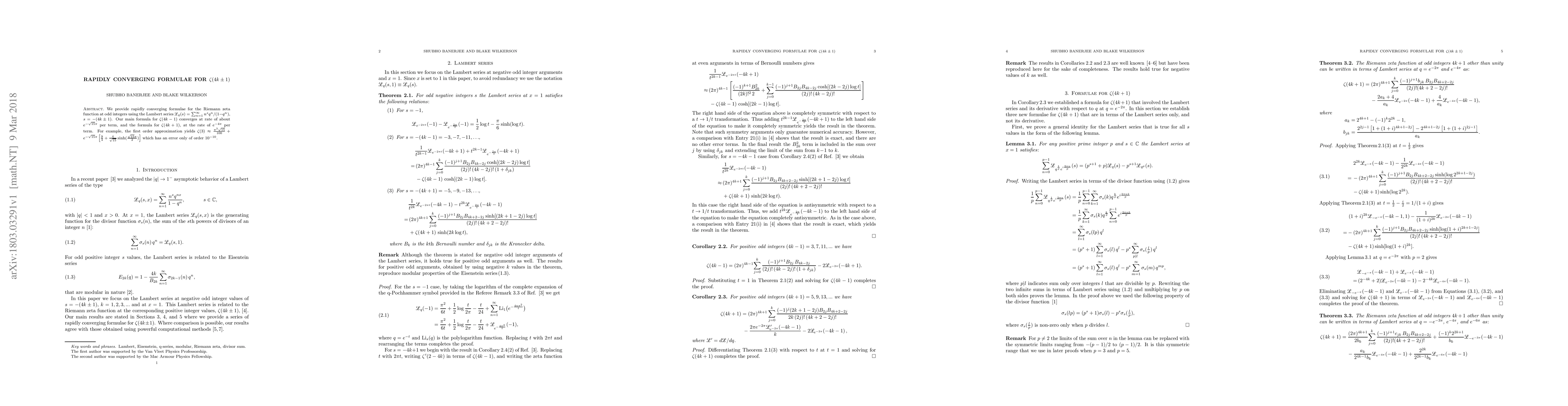 This paper presents rapidly converging formulae for the Riemann zeta function at odd integers, specifically $\zeta(4k\pm 1)$, using Lambert series. The formula for $\zeta(4k-1)$ converges at a rate of $e^{-\sqrt{15}\pi}$ per term, while $\zeta(4k+1)$ converges at a rate of $e^{-4\pi}$ per term, achieving high precision with minimal terms.
