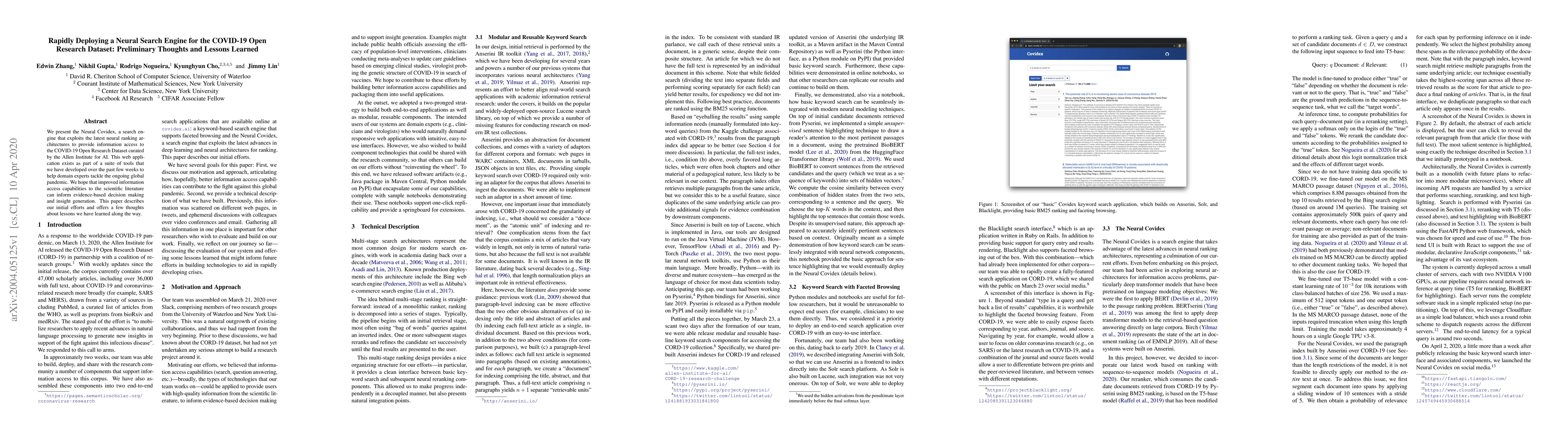 The paper introduces Neural Covidex, a neural search engine for the COVID-19 Open Research Dataset, aiming to enhance access to scientific literature for informed decision-making. It shares initial experiences and valuable lessons from its rapid development.