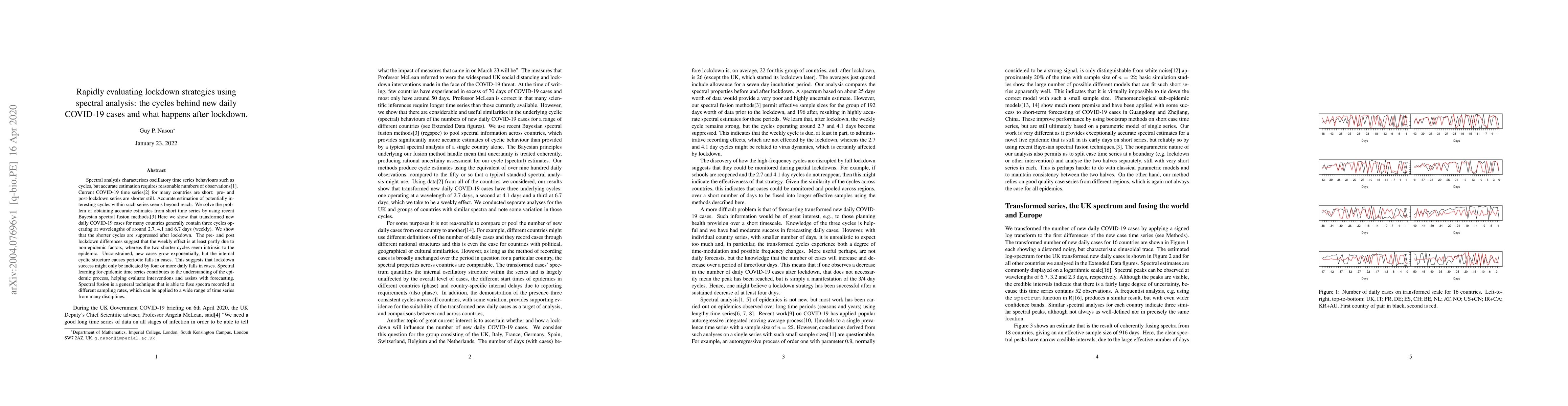 Spectral analysis characterises oscillatory time series behaviours such as cycles, but accurate estimation requires reasonable numbers of observations. Current COVID-19 time series for many countries are short: pre- and post-lockdown series are shorter still. Accurate estimation of potentially interesting cycles within such series seems beyond reach. We solve the problem of obtaining accurate estimates from short time series by using recent Bayesian spectral fusion methods. Here we show that transformed new daily COVID-19 cases for many countries generally contain three cycles operating at wavelengths of around 2.7, 4.1 and 6.7 days (weekly). We show that the shorter cycles are suppressed after lockdown. The pre- and post lockdown differences suggest that the weekly effect is at least partly due to non-epidemic factors, whereas the two shorter cycles seem intrinsic to the epidemic. Unconstrained, new cases grow exponentially, but the internal cyclic structure causes periodic falls in cases. This suggests that lockdown success might only be indicated by four or more daily falls in cases. Spectral learning for epidemic time series contributes to the understanding of the epidemic process, helping evaluate interventions and assists with forecasting. Spectral fusion is a general technique that is able to fuse spectra recorded at different sampling rates, which can be applied to a wide range of time series from many disciplines.