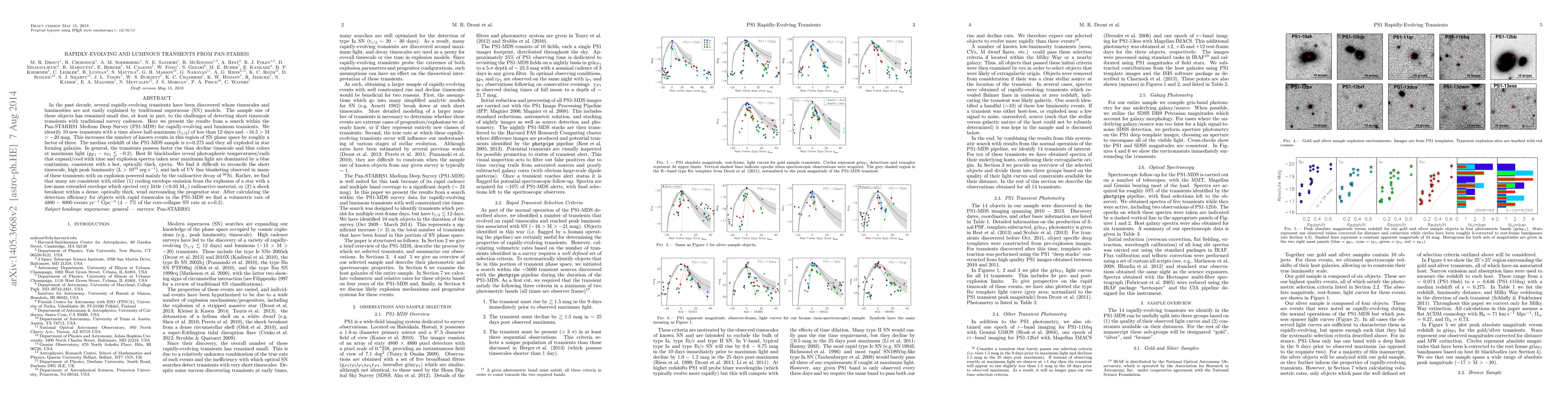 In the past decade, several rapidly-evolving transients have been discovered whose timescales and luminosities are not easily explained by traditional supernovae (SN) models. The sample size of these objects has remained small due, at least in part, to the challenge of detecting short timescale transients with traditional survey cadences. Here we present the results from a search within the Pan-STARRS1 Medium Deep Survey (PS1-MDS) for rapidly-evolving and luminous transients. We identify 10 new transients with a time above half-maximum of less than 12 days and -16.5 > M > -20 mag. This increases the number of known events in this region of SN phase space by roughly a factor of three. The median redshift of the PS1-MDS sample is z=0.275 and they all exploded in star forming galaxies. In general, the transients possess faster rise than decline timescale and blue colors at maximum light (g - r < -0.2). Best fit blackbodies reveal photospheric temperatures/radii that expand/cool with time and explosion spectra taken near maximum light are dominated by a blue continuum, consistent with a hot, optically thick, ejecta. We find it difficult to reconcile the short timescale, high peak luminosity (L > 10^43 erg/s), and lack of UV line blanketing observed in many of these transients with an explosion powered mainly by the radioactive decay of Ni-56. Rather, we find that many are consistent with either (1) cooling envelope emission from the explosion of a star with a low-mass extended envelope which ejected very little (<0.03 M_sun) radioactive material, or (2) a shock breakout within a dense, optically thick, wind surrounding the progenitor star. After calculating the detection efficiency for objects with rapid timescales in the PS1-MDS we find a volumetric rate of 4800 - 8000 events/yr/Gpc^3 (4-7% of the core-collapse SN rate at z=0.2).