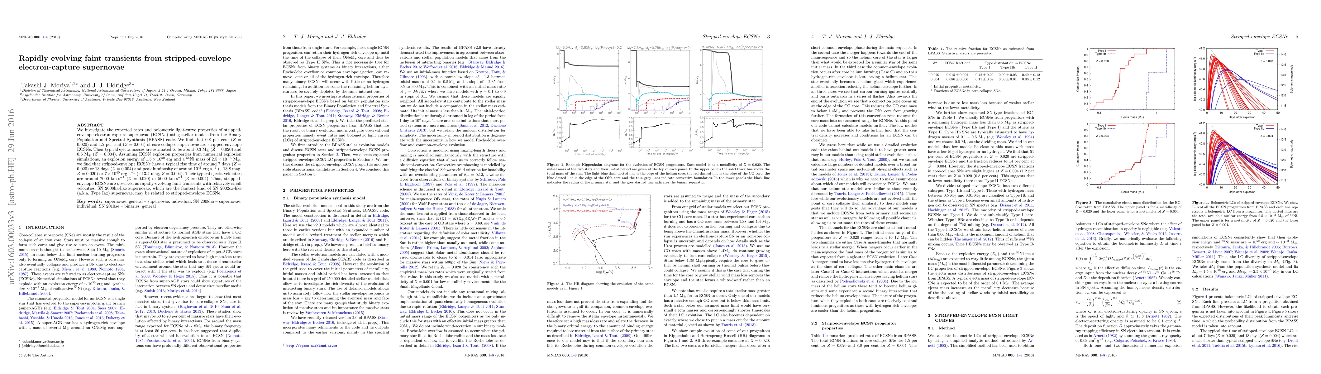 This paper examines stripped-envelope electron-capture supernovae (ECSNe) and finds they constitute 0.8-1.2% of core-collapse supernovae, exhibiting rapid evolution, faint luminosity, and small ejecta velocities. These transients peak at luminosities around 1e41 erg/s and have rise times of 7-13 days.