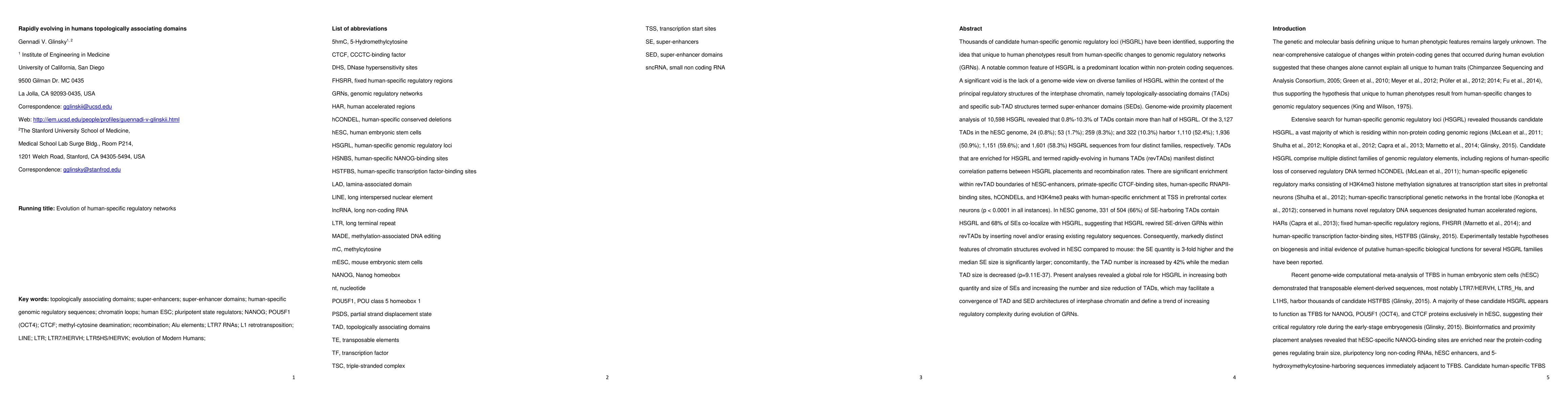 Genome-wide proximity placement analysis of 10,598 HSGRL within the context of the principal regulatory structures of the interphase chromatin, namely topologically-associating domains (TADs) and specific sub-TAD structures termed super-enhancer domains (SEDs) revealed that 0.8%-10.3% of TADs contain more than half of HSGRL. Of the 3,127 TADs in the hESC genome, 24 (0.8%); 53 (1.7%); 259 (8.3%); and 322 (10.3%) harbor 1,110 (52.4%); 1,936 (50.9%); 1,151 (59.6%); and 1,601 (58.3%) HSGRL sequences from four distinct families, respectively. TADs that are enriched for HSGRL and termed rapidly-evolving in humans TADs (revTADs) manifest distinct correlation patterns between HSGRL placements and recombination rates. There are significant enrichment within revTAD boundaries of hESC-enhancers, primate-specific CTCF-binding sites, human-specific RNAPII-binding sites, hCONDELs, and H3K4me3 peaks with human-specific enrichment at TSS in prefrontal cortex neurons (p < 0.0001 in all instances). In hESC genome, 331 of 504 (66%) of SE-harboring TADs contain HSGRL and 68% of SEs co-localize with HSGRL, suggesting that HSGRL rewired SE-driven GRNs within revTADs by inserting novel and/or erasing existing regulatory sequences. Consequently, markedly distinct features of chromatin structures evolved in hESC compared to mouse: the SE quantity is 3-fold higher and the median SE size is significantly larger; concomitantly, the TAD number is increased by 42% while the median TAD size is decreased (p=9.11E-37). Present analyses revealed a global role for HSGRL in increasing both quantity and size of SEs and increasing the number and size reduction of TADs, which may facilitate a convergence of TAD and SED architectures of interphase chromatin and define a trend of increasing regulatory complexity during evolution of GRNs.