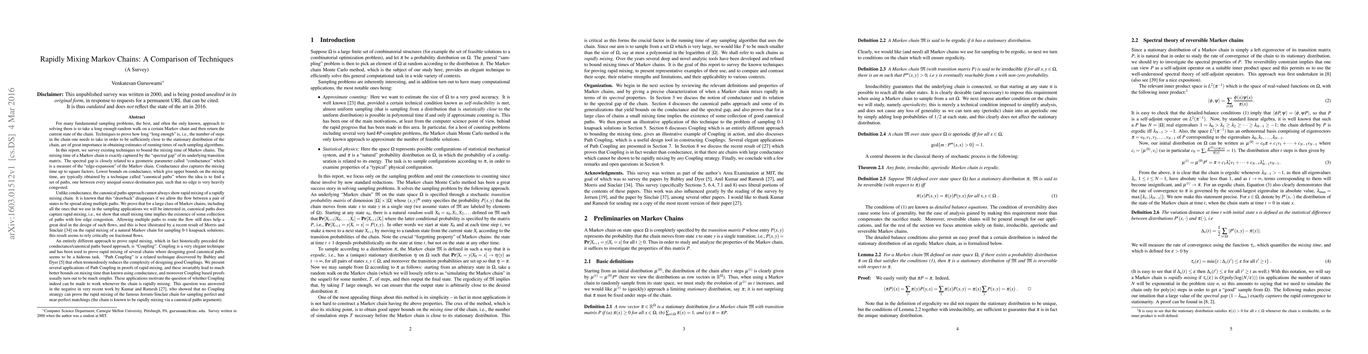 We survey existing techniques to bound the mixing time of Markov chains. The mixing time is related to a geometric parameter called conductance which is a measure of edge-expansion. Bounds on conductance are typically obtained by a technique called "canonical paths" where the idea is to find a set of paths, one between every source-destination pair, such that no edge is heavily congested. However, the canonical paths approach cannot always show rapid mixing of a rapidly mixing chain. This drawback disappears if we allow the flow between a pair of states to be spread along multiple paths. We prove that for a large class of Markov chains canonical paths does capture rapid mixing. Allowing multiple paths to route the flow still does help a great deal in proofs, as illustrated by a result of Morris & Sinclair (FOCS'99) on the rapid mixing of a Markov chain for sampling 0/1 knapsack solutions. A different approach to prove rapid mixing is "Coupling". Path Coupling is a variant discovered by Bubley & Dyer (FOCS'97) that often tremendously reduces the complexity of designing good Couplings. We present several applications of Path Coupling in proofs of rapid mixing. These invariably lead to much better bounds on mixing time than known using conductance, and moreover Coupling based proofs are typically simpler. This motivates the question of whether Coupling can be made to work whenever the chain is rapidly mixing. This question was answered in the negative by Kumar & Ramesh (FOCS'99), who showed that no Coupling strategy can prove the rapid mixing of the Jerrum-Sinclair chain for sampling perfect and near-perfect matchings.