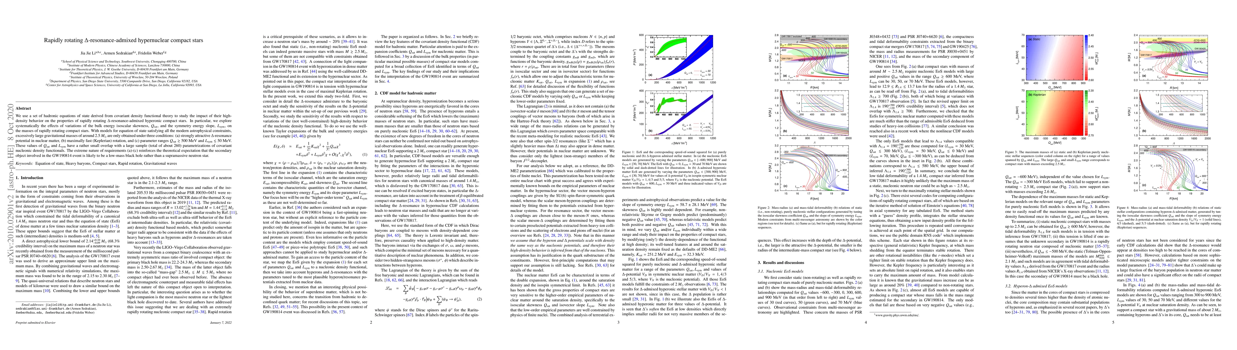 We use a set of hadronic equations of state derived from covariant density functional theory to study the impact of their high-density behavior on the properties of rapidly rotating $\Delta$-resonance-admixed hyperonic compact stars. In particular, we explore systematically the effects of variations of the bulk energy isoscalar skewness, $Q_{\mathrm{sat}}$, and the symmetry energy slope, $L_{\mathrm{sym}}$, on the masses of rapidly rotating compact stars. With models for equation of state satisfying all the modern astrophysical constraints, excessively large gravitational masses of around $2.5 \, M_{\odot}$ are only obtained under three conditions: (a) strongly attractive $\Delta$-resonance potential in nuclear matter, (b) maximally fast (Keplerian) rotation, and (c) parameter ranges $Q_{\mathrm{sat}}\gtrsim500$ MeV and $L_{\mathrm{sym}}\lesssim50$ MeV. These values of $Q_{\mathrm{sat}}$ and $L_{\mathrm{sym}}$ have a rather small overlap with a large sample (total of about 260) parametrizations of covariant nucleonic density functionals. The extreme nature of requirements (a)-(c) reinforces the theoretical expectation that the secondary object involved in the GW190814 event is likely to be a low-mass black hole rather than a supramassive neutron star.