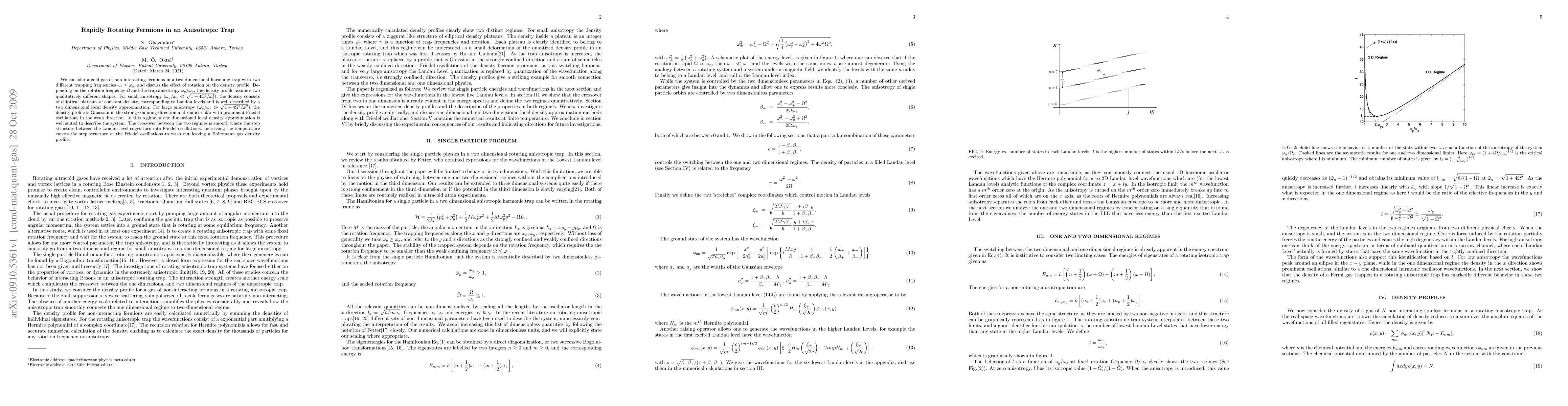 We consider a cold gas of non-interacting fermions in a two dimensional harmonic trap with two different trapping frequencies $\omega_x \leq \omega_y$, and discuss the effect of rotation on the density profile. Depending on the rotation frequency $\Omega$ and the trap anisotropy $\omega_y/\omega_x$, the density profile assumes two qualitatively different shapes. For small anisotropy ($\omega_y/\omega_x \ll \sqrt{1+4 \Omega^2/\omega_x^2}$), the density consists of elliptical plateaus of constant density, corresponding to Landau levels and is well described by a two dimensional local density approximation. For large anisotropy ($\omega_y/\omega_x \gg \sqrt{1+4 \Omega^2/\omega_x^2}$), the density profile is Gaussian in the strong confining direction and semicircular with prominent Friedel oscillations in the weak direction. In this regime, a one dimensional local density approximation is well suited to describe the system. The crossover between the two regimes is smooth where the step structure between the Landau level edges turn into Friedel oscillations. Increasing the temperature causes the step structure or the Friedel oscillations to wash out leaving a Boltzmann gas density profile.