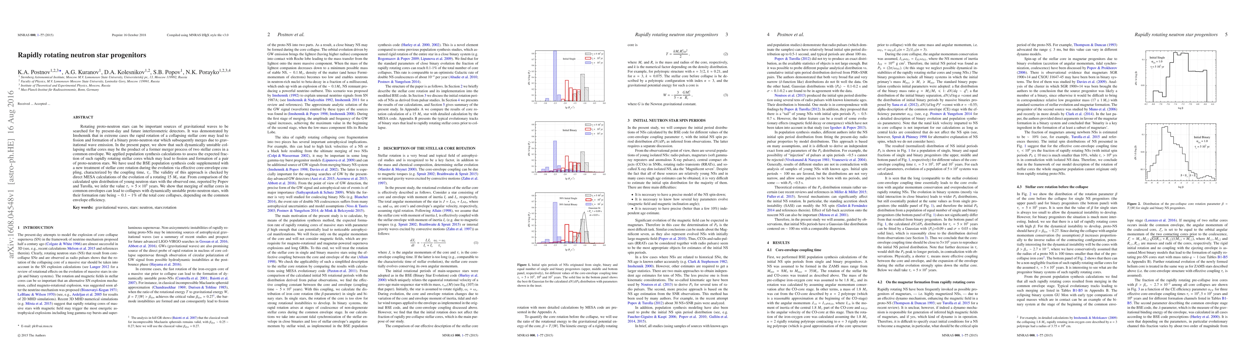 This paper investigates the progenitors of rapidly rotating neutron stars, demonstrating that dynamically unstable collapsing stellar cores, which may lead to fission and formation of binary proto-neutron stars, often result from mergers of two stellar cores in a common envelope. Using population synthesis calculations and a new treatment of core rotation, the study estimates the formation rate of such unstable cores to be around 0.1-1% of total core collapses.