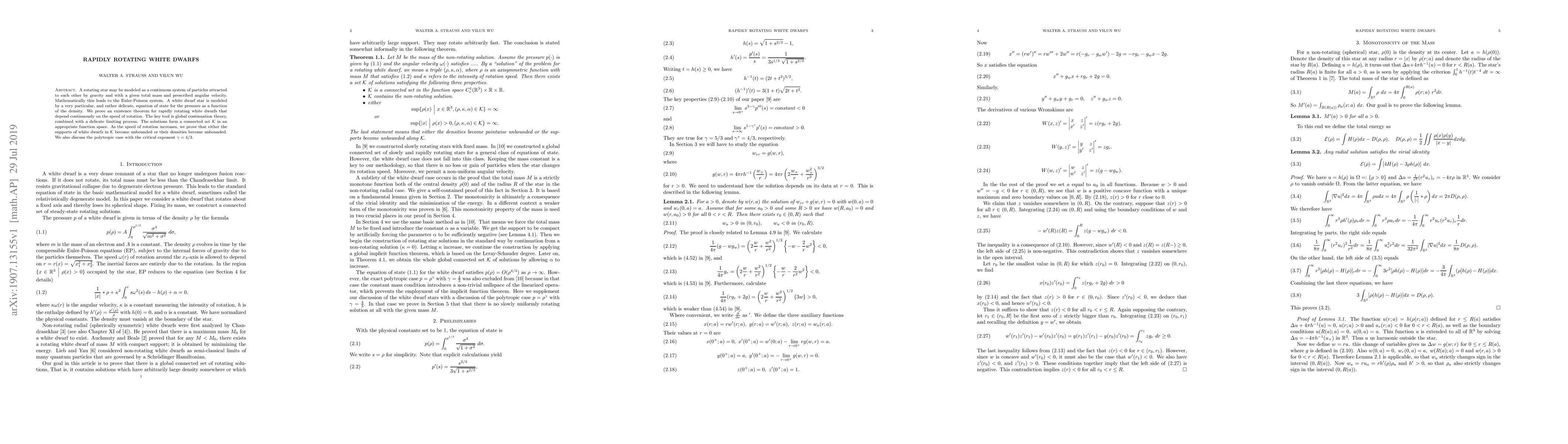 This paper proves the existence of rapidly rotating white dwarf stars modeled by a specific equation of state, showing that as rotation speeds increase, the supports or densities of these stars become unbounded. The study uses global continuation theory and a limiting process to demonstrate the continuous dependence of solutions on rotation speed.