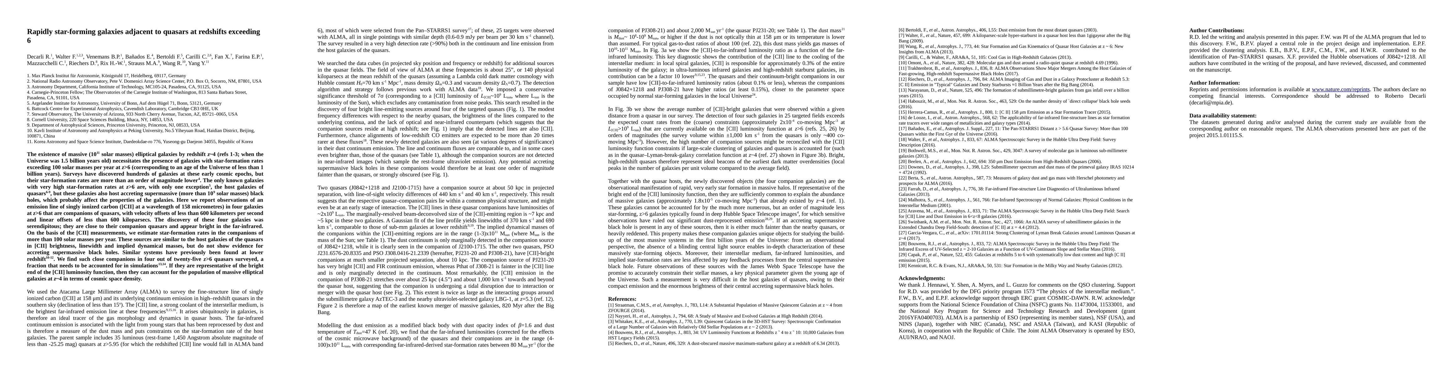 This study reports the discovery of four galaxies at redshifts greater than 6, companions to quasars, exhibiting high star-formation rates of over 100 solar masses per year. These galaxies, detected through singly ionized carbon ([CII]) emission, are bright in far-infrared and share similar properties with quasar host galaxies but lack evidence of accreting supermassive black holes. The findings suggest these galaxies could explain the formation of massive elliptical galaxies observed at redshift ~4.