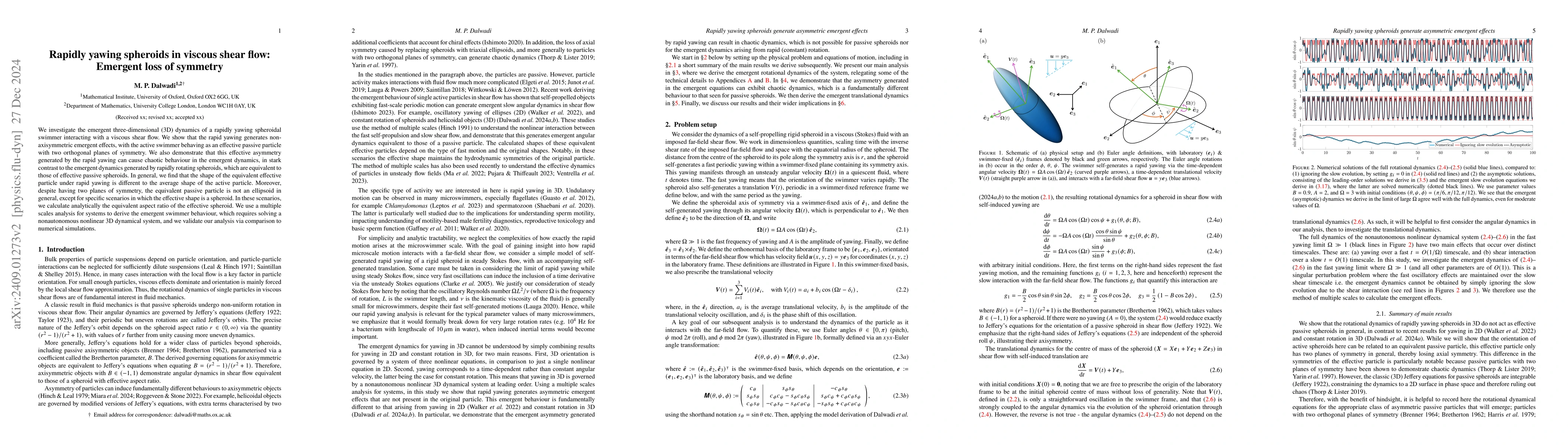 We investigate the emergent dynamics of a rapidly yawing spheroidal swimmer interacting with a viscous shear flow. We show that the rapid yawing generates non-axisymmetric emergent effects, with the active swimmer behaving as an effective passive particle with two orthogonal planes of symmetry. The shape of the equivalent effective particle is different to the average shape of the active particle. Moreover, despite having two planes of symmetry, the equivalent passive particle is not an ellipsoid in general, except for specific scenarios in which the effective shape is a spheroid. We use a multiple scales analysis for systems to derive the emergent swimmer behaviour, which requires solving a nonautonomous nonlinear 3D dynamical system, and we validate our analysis via comparison to numerical simulations.