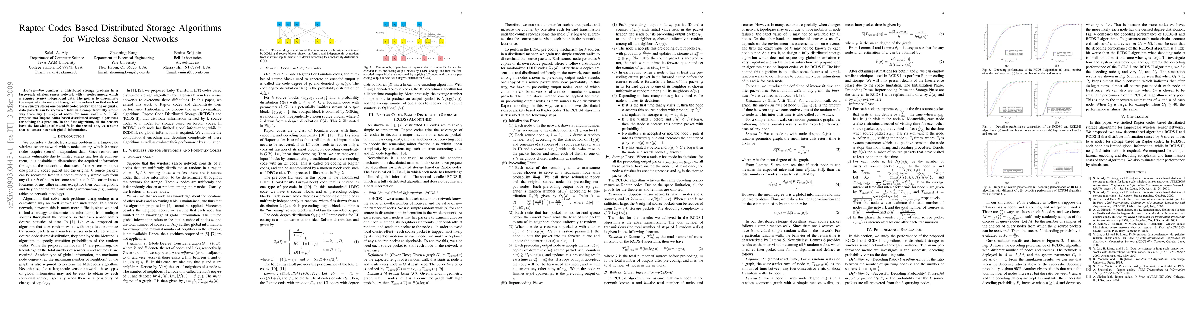 We consider a distributed storage problem in a large-scale wireless sensor network with $n$ nodes among which $k$ acquire (sense) independent data. The goal is to disseminate the acquired information throughout the network so that each of the $n$ sensors stores one possibly coded packet and the original $k$ data packets can be recovered later in a computationally simple way from any $(1+\epsilon)k$ of nodes for some small $\epsilon>0$. We propose two Raptor codes based distributed storage algorithms for solving this problem. In the first algorithm, all the sensors have the knowledge of $n$ and $k$. In the second one, we assume that no sensor has such global information.