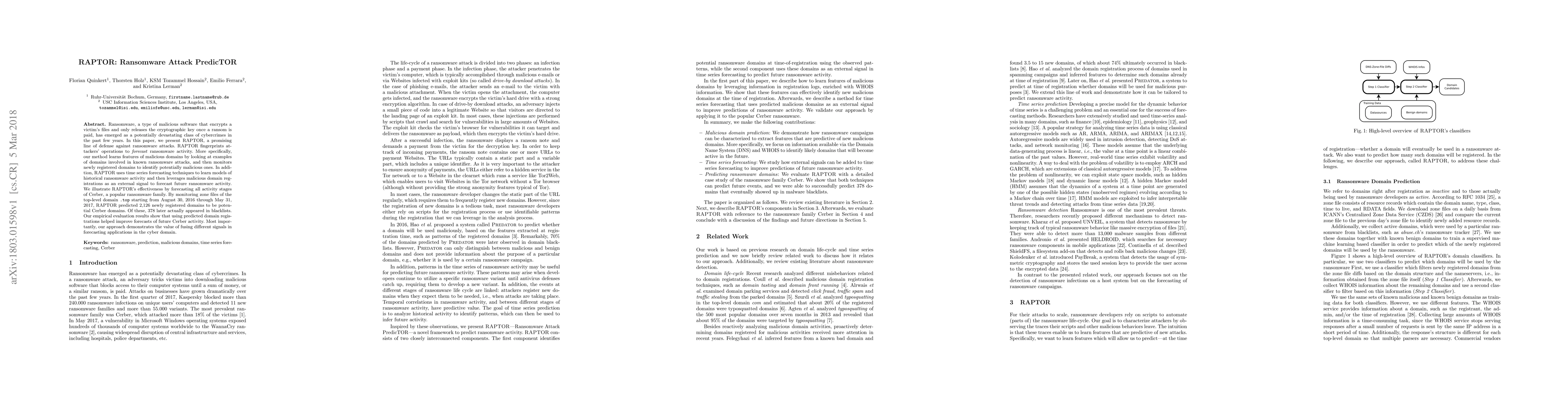 RAPTOR is a predictive tool designed to counter ransomware attacks by identifying potentially malicious domains and forecasting future ransomware activity. It combines domain fingerprinting and time series forecasting to enhance detection and prediction, demonstrating effectiveness in forecasting Cerber ransomware activity.