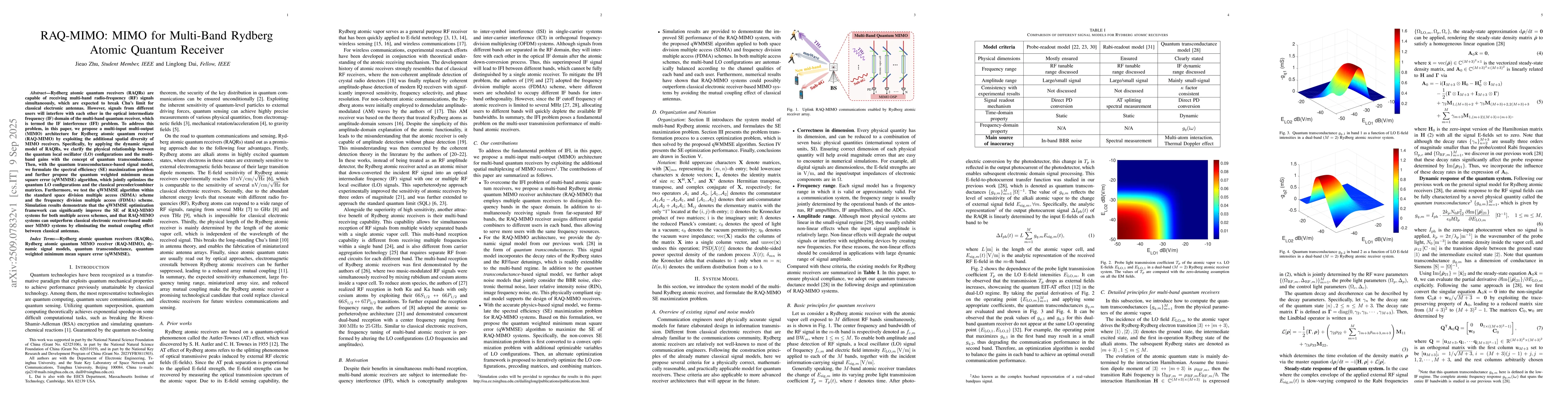 Rydberg atomic quantum receivers (RAQRs) are capable of receiving multi-band radio-frequency (RF) signals simultaneously, which are expected to break Chu's limit for classical electronic antennas. However, signals from different users will interfere with each other in the optical intermediate frequency (IF) domain of the multi-band quantum receiver, which is termed the IF interference (IFI) problem. To address this problem, in this paper, we propose a multi-input multi-output (MIMO) architecture for Rydberg atomic quantum receiver (RAQ-MIMO) by exploiting the additional spatial diversity of MIMO receivers. Specifically, by applying the dynamic signal model of RAQRs, we clarify the physical relationship between the quantum local oscillator (LO) configurations and the multi-band gains with the concept of quantum transconductance. Then, with the quantum transconductance-based signal model, we formulate the spectral efficiency (SE) maximization problem and further propose the quantum weighted minimum mean square error (qWMMSE) algorithm, which jointly optimizes the quantum LO configurations and the classical precoder/combiner matrices. Furthermore, we test the qWMMSE algorithm within the standard space division multiple access (SDMA) scheme and the frequency division multiple access (FDMA) scheme. Simulation results demonstrate that the qWMMSE optimization framework can significantly improve the SE of RAQ-MIMO systems for both multiple access schemes, and that RAQ-MIMO systems can outperform classical electronic receiver-based multi-user MIMO systems by eliminating the mutual coupling effect between classical antennas.