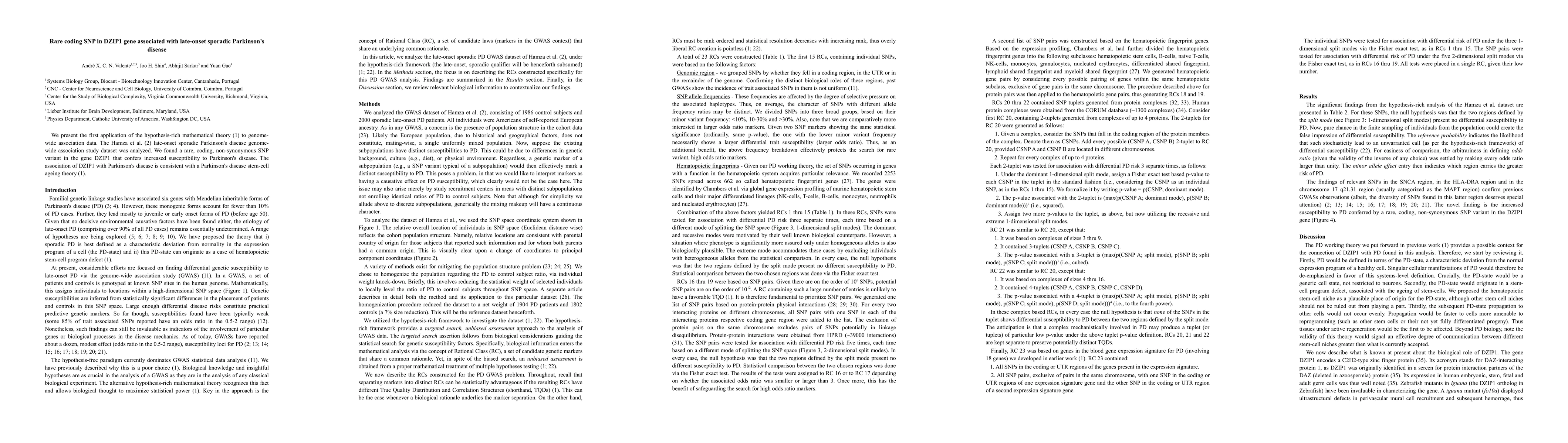 We present the first application of the hypothesis-rich mathematical theory to genome-wide association data. The Hamza et al. late-onset sporadic Parkinson's disease genome-wide association study dataset was analyzed. We found a rare, coding, non-synonymous SNP variant in the gene DZIP1 that confers increased susceptibility to Parkinson's disease. The association of DZIP1 with Parkinson's disease is consistent with a Parkinson's disease stem-cell ageing theory.