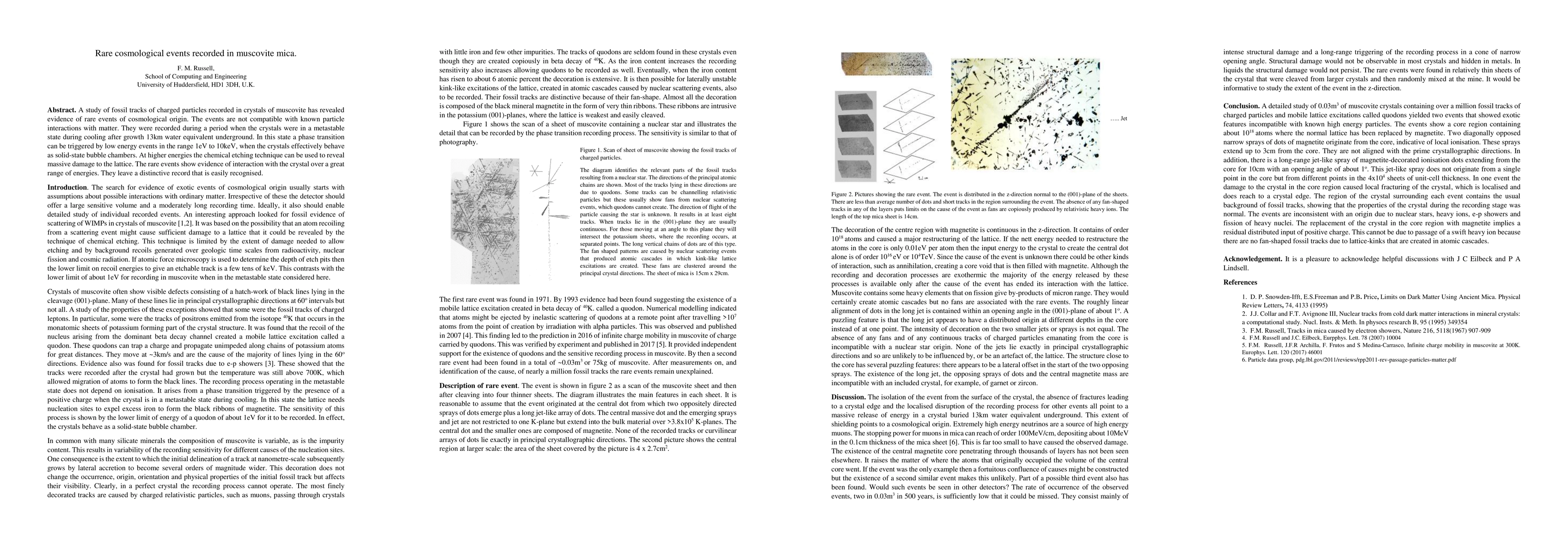 This study reveals rare cosmological events recorded in muscovite mica crystals, showing interactions not explained by known particle physics. The crystals, located deep underground, act as solid-state bubble chambers, capturing low energy events and leaving distinctive tracks.