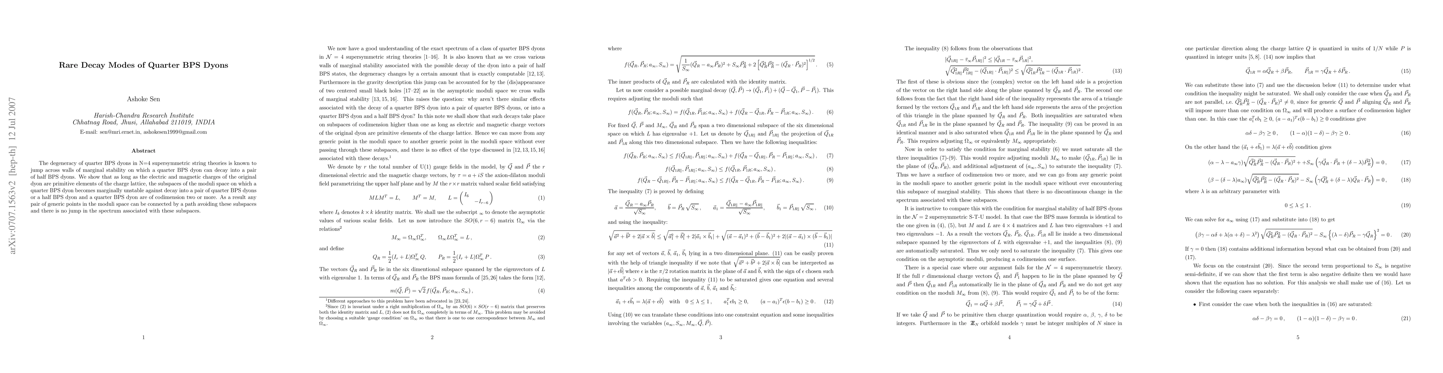 This paper investigates rare decay modes of quarter BPS dyons in N=4 supersymmetric string theories, demonstrating that when the electric and magnetic charges are primitive lattice elements, the decay into other BPS states occurs through higher codimension subspaces, thus preventing spectral jumps.
