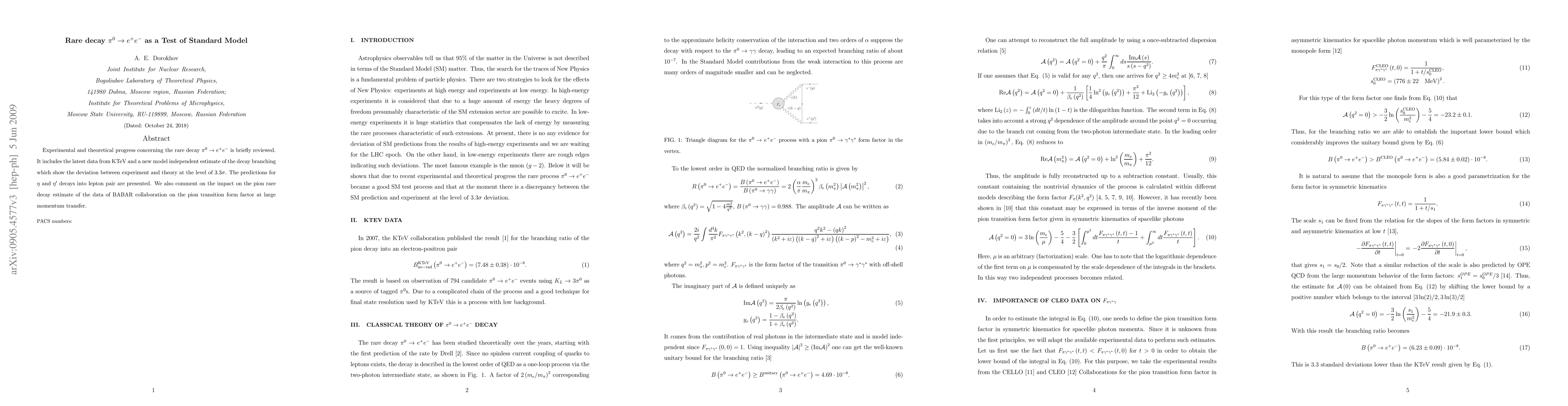 The paper reviews progress on the rare decay of a neutral pion (pi^0) into an electron-positron pair (e^+e^-), revealing a 3.3sigma discrepancy between experimental data from KTeV and theoretical predictions of the Standard Model. It also discusses implications for eta and eta' decays and the BABAR collaboration's findings on the pion transition form factor at high momentum.