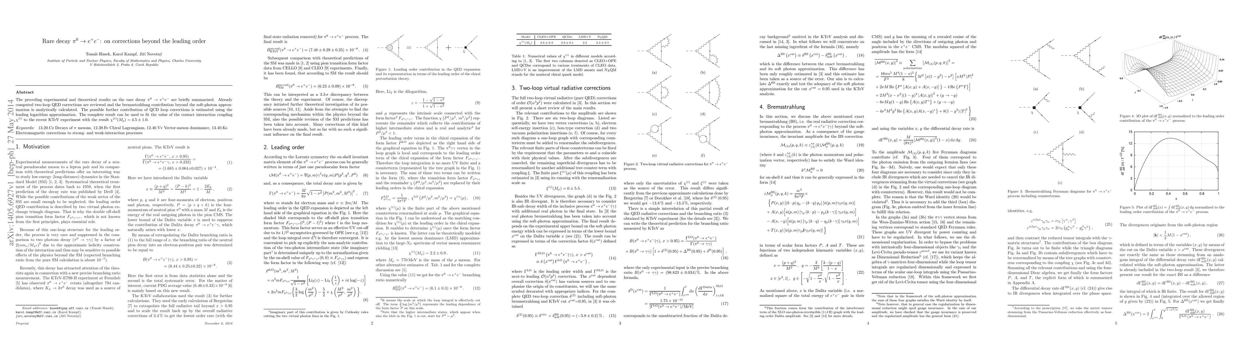 The preceding experimental and theoretical results on the rare decay $\pi^0 \to e^+e^-$ are briefly summarized. Already computed two-loop QED corrections are reviewed and the bremsstrahlung contribution beyond the soft-photon approximation is analytically calculated. The possible further contribution of QCD loop corrections is estimated using the leading logarithm approximation. The complete result can be used to fit the value of the contact interaction coupling $\chi^r$ to the recent KTeV experiment with the result $\chi^r(M_\rho) = 4.5 \pm 1.0$.