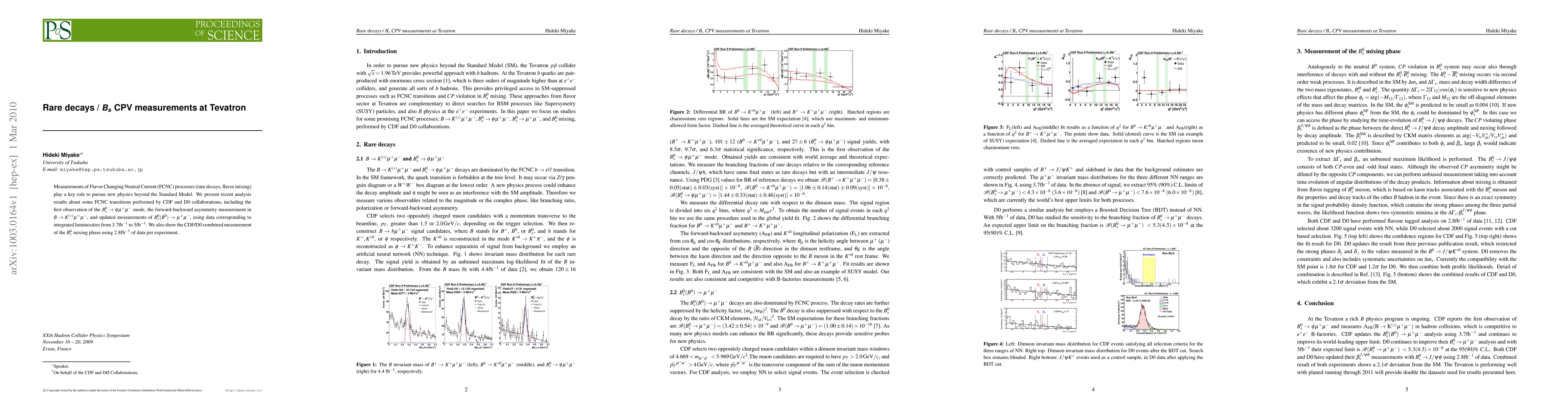 Measurements of Flavor Changing Neutral Current (FCNC) processes (rare decays, flavor mixing) play a key role to pursue new physics beyond the Standard Model. We present recent analysis results about some FCNC transitions performed by CDF and D0 collaborations, including the first observation of the B_s->phi mu^+mu^- mode, the forward-backward asymmetry measurement in B->K^(*) mu^+mu^-, and updated measurements of B_s (B^0)->mu^+mu^-, using data corresponding to integrated luminosities from 3.7/fb to 5/fb. We also show the CDF/D0 combined measurement of the B_s mixing phase using 2.8/fb of data per experiment.