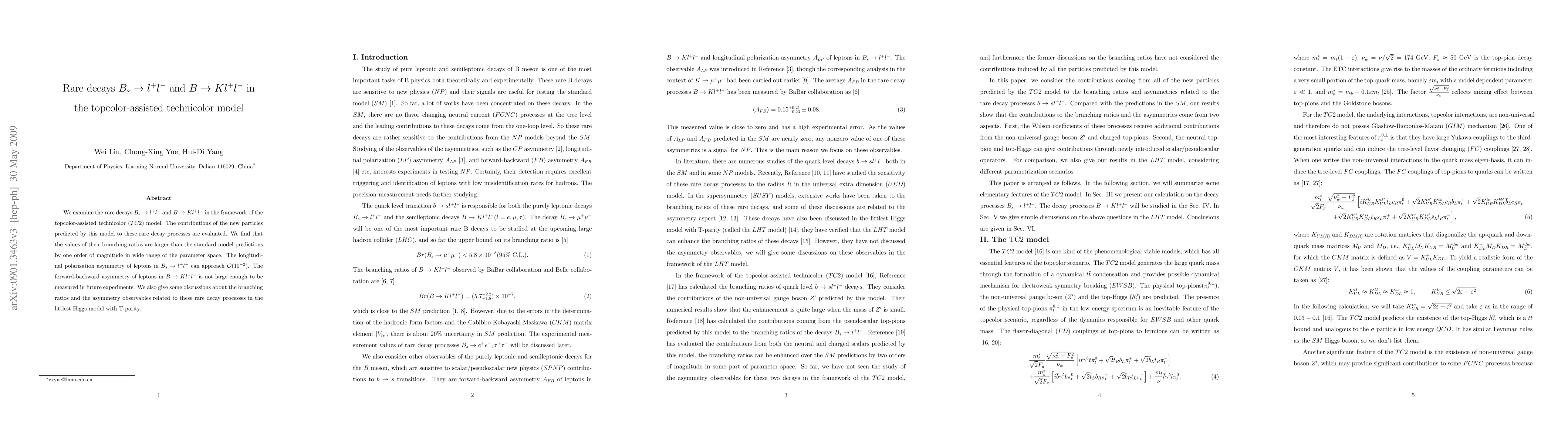 This paper investigates rare decays $B_s\to l^+l^-$ and $B\to Kl^+l^-$ within the topcolor-assisted technicolor model, finding branching ratios significantly larger than standard model predictions by an order of magnitude. The study also notes potential longitudinal polarization asymmetries in $B_s$ decays.