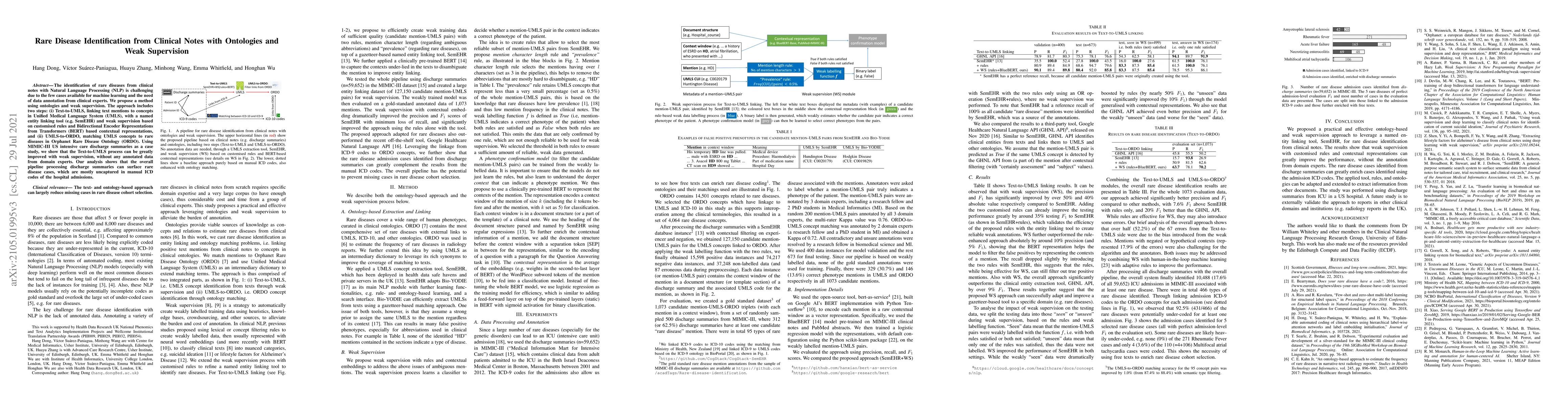 This paper proposes a method for identifying rare diseases from clinical notes using NLP, ontologies, and weak supervision. It employs a text-to-UMLS linking process and a UMLS-to-ORDO matching step to detect rare diseases, demonstrating improved performance without expert annotations. The method successfully identifies rare diseases in MIMIC-III discharge summaries that are often missed in manual ICD coding.