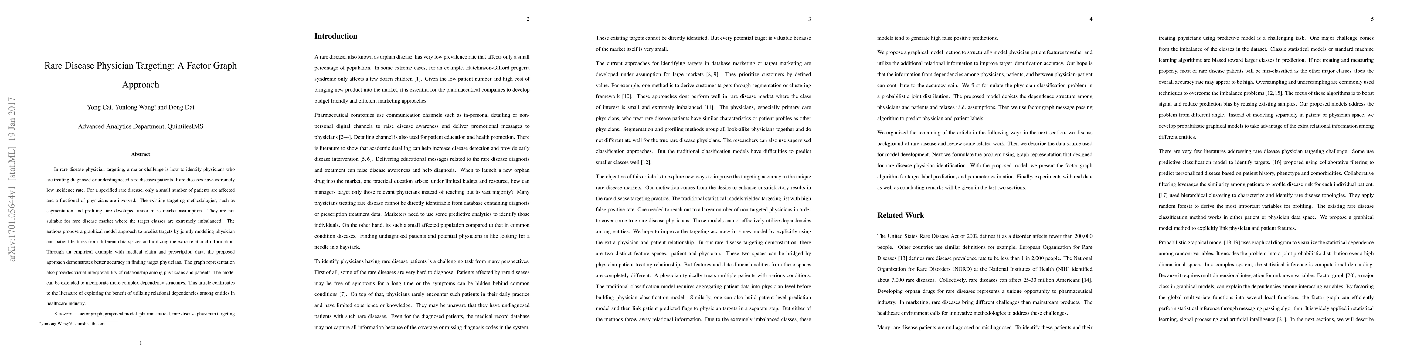 In rare disease physician targeting, a major challenge is how to identify physicians who are treating diagnosed or underdiagnosed rare diseases patients. Rare diseases have extremely low incidence rate. For a specified rare disease, only a small number of patients are affected and a fractional of physicians are involved. The existing targeting methodologies, such as segmentation and profiling, are developed under mass market assumption. They are not suitable for rare disease market where the target classes are extremely imbalanced. The authors propose a graphical model approach to predict targets by jointly modeling physician and patient features from different data spaces and utilizing the extra relational information. Through an empirical example with medical claim and prescription data, the proposed approach demonstrates better accuracy in finding target physicians. The graph representation also provides visual interpretability of relationship among physicians and patients. The model can be extended to incorporate more complex dependency structures. This article contributes to the literature of exploring the benefit of utilizing relational dependencies among entities in healthcare industry.