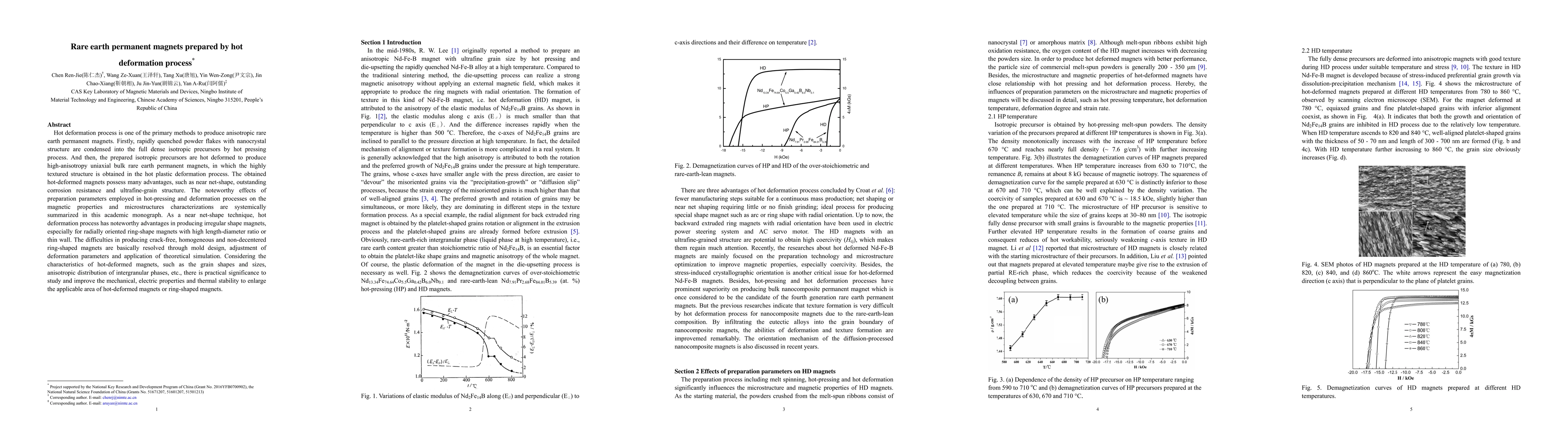 Hot deformation process is one of the primary methods to produce anisotropic rare earth permanent magnets. Firstly, rapidly quenched powder flakes with nanocrystal structure are condensed into the full dense isotropic precursors by hot pressing process. And then, the prepared isotropic precursors are hot deformed to produce high-anisotropy uniaxial bulk rare earth permanent magnets, in which the highly textured structure is obtained in the hot plastic deformation process. The obtained hot-deformed magnets possess many advantages, such as near net-shape, outstanding corrosion resistance and ultrafine-grain structure. The noteworthy effects of preparation parameters employed in hot-pressing and deformation processes on the magnetic properties and microstructures characterizations are systemically summarized in this academic monograph. As a near net-shape technique, hot deformation process has noteworthy advantages in producing irregular shape magnets, especially for radially oriented ring-shape magnets with high length-diameter ratio or thin wall. The difficulties in producing crack-free, homogeneous and non-decentered ring-shaped magnets are basically resolved through mold design, adjustment of deformation parameters and application of theoretical simulation. Considering the characteristics of hot-deformed magnets, such as the grain shapes and sizes, anisotropic distribution of intergranular phases, etc., there is practical significance to study and improve the mechanical, electric properties and thermal stability to enlarge the applicable area of hot-deformed magnets or ring-shaped magnets.