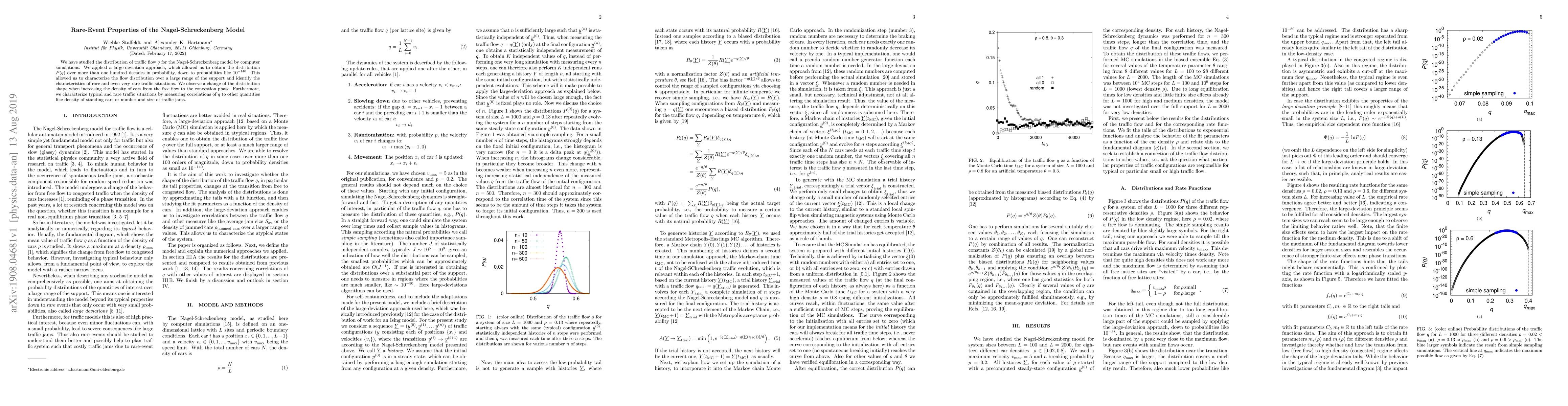 This study uses computer simulations and large-deviation theory to analyze the rare-event properties of traffic flow in the Nagel-Schreckenberg model, revealing significant changes in distribution shape from free flow to congestion and identifying correlations between traffic flow and factors like standing cars and traffic jams.