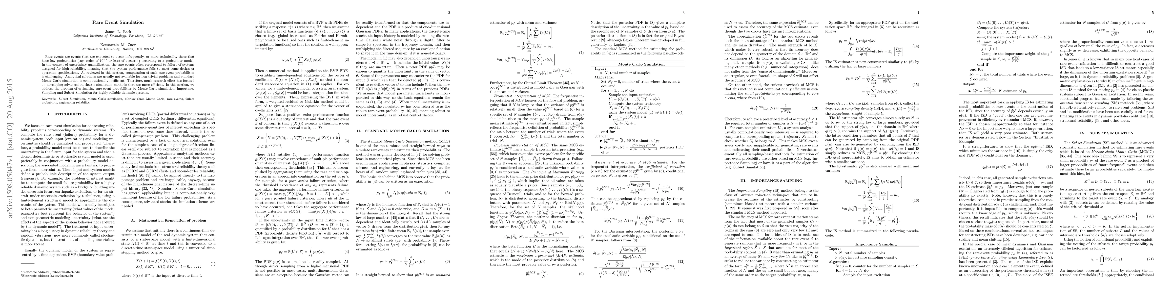 Rare events are events that are expected to occur infrequently, or more technically, those that have low probabilities (say, order of $10^{-3}$ or less) of occurring according to a probability model. In the context of uncertainty quantification, the rare events often correspond to failure of systems designed for high reliability, meaning that the system performance fails to meet some design or operation specifications. As reviewed in this section, computation of such rare-event probabilities is challenging. Analytical solutions are usually not available for non-trivial problems and standard Monte Carlo simulation is computationally inefficient. Therefore, much research effort has focused on developing advanced stochastic simulation methods that are more efficient. In this section, we address the problem of estimating rare-event probabilities by Monte Carlo simulation, Importance Sampling and Subset Simulation for highly reliable dynamic systems.