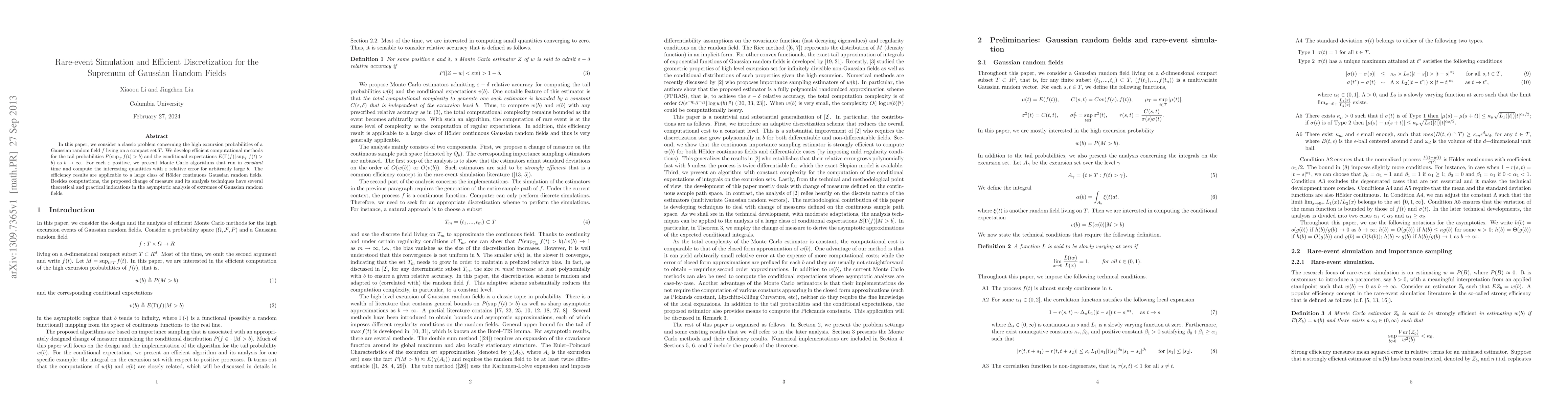 This paper develops efficient Monte Carlo algorithms for computing the tail probabilities and conditional expectations of the supremum of Gaussian random fields over a compact set, achieving constant time performance with arbitrary precision. The methods are broadly applicable to Hölder continuous Gaussian random fields and contribute to the theoretical analysis of extreme values in such fields.