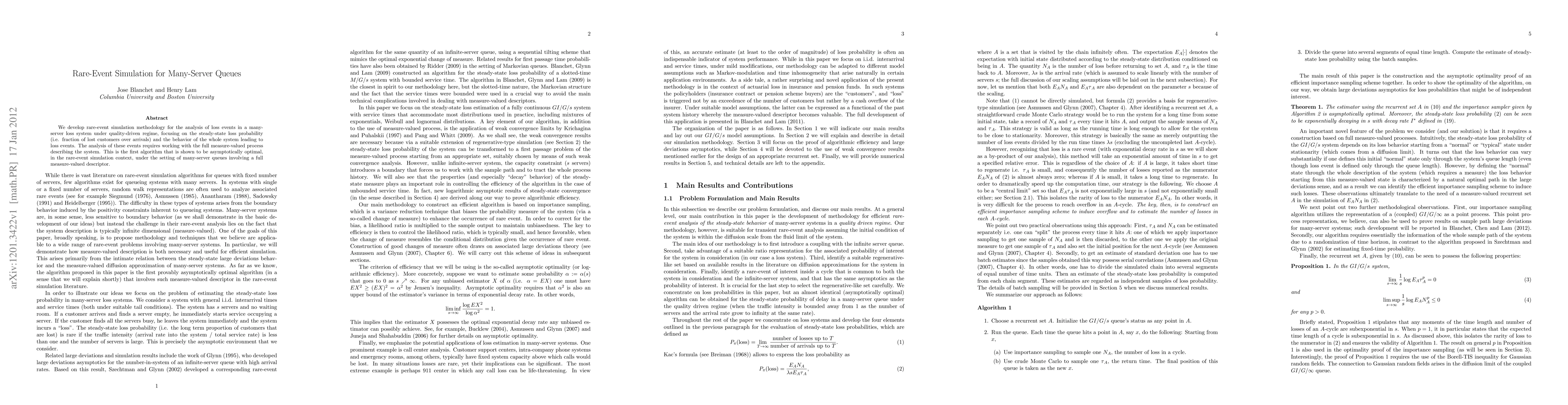 This paper introduces a rare-event simulation methodology for analyzing loss events in many-server queues, focusing on steady-state loss probability. It presents an asymptotically optimal algorithm for the rare-event simulation context, specifically for systems described by full measure-valued processes.