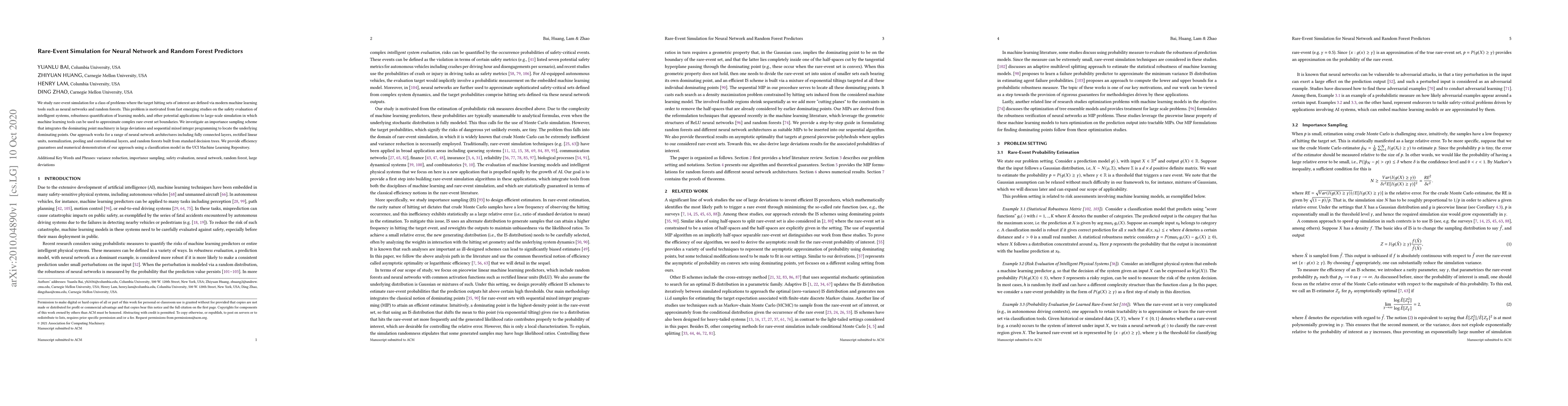 This paper proposes an importance sampling scheme for rare-event simulation in neural networks and random forests, integrating large deviations and sequential mixed integer programming to identify dominating points. The method is demonstrated on a classification model from the UCI Machine Learning Repository, showing efficiency and applicability to various neural network architectures.