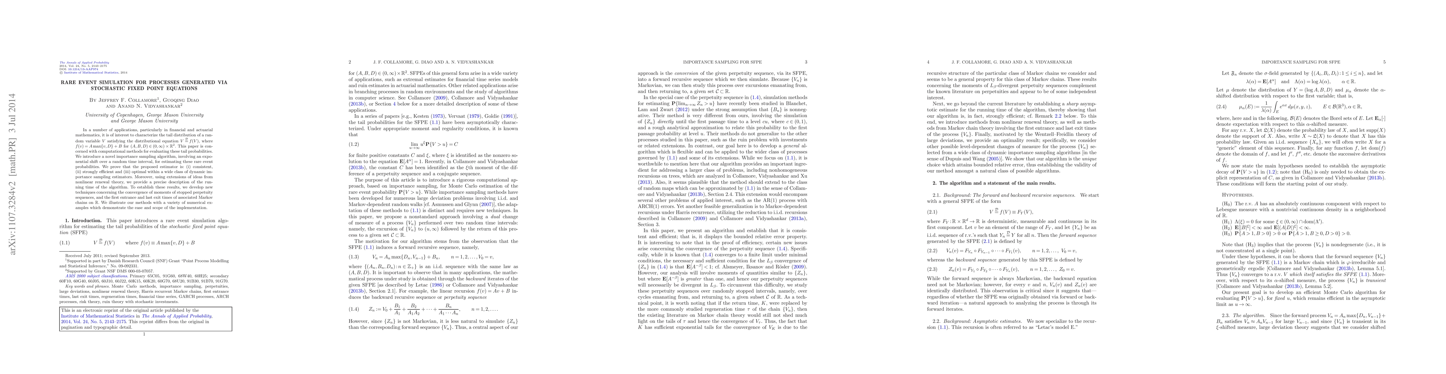 This paper develops a novel importance sampling algorithm for estimating rare event probabilities in stochastic fixed point processes, particularly relevant in financial and actuarial mathematics. The proposed method is shown to be consistent, strongly efficient, and optimal, with new techniques developed to analyze its convergence and running time.