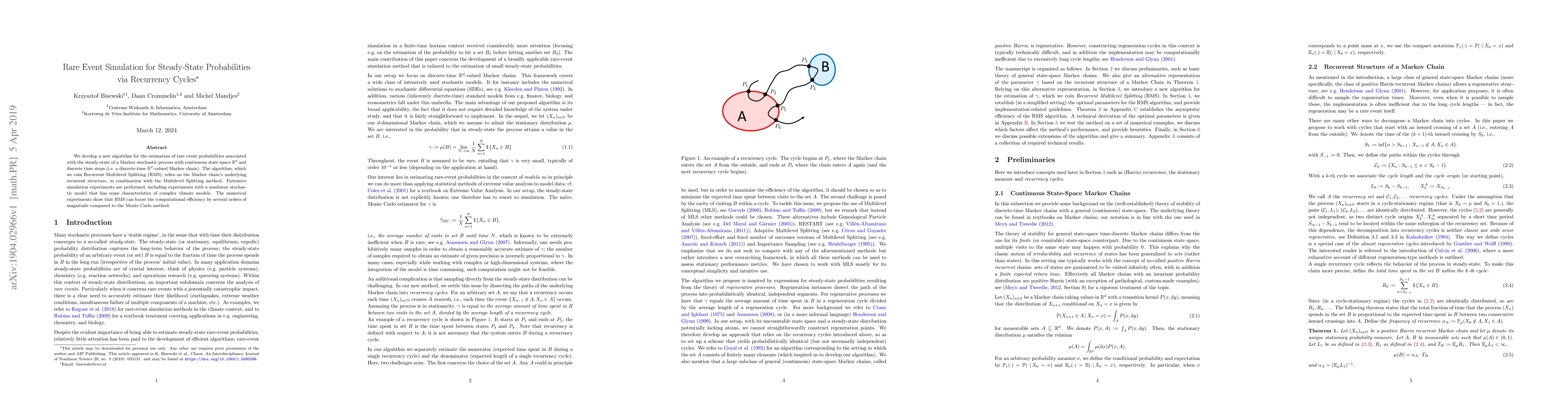 A new algorithm called Recurrent Multilevel Splitting (RMS) efficiently estimates rare event probabilities in Markov stochastic processes, outperforming traditional Monte Carlo methods.