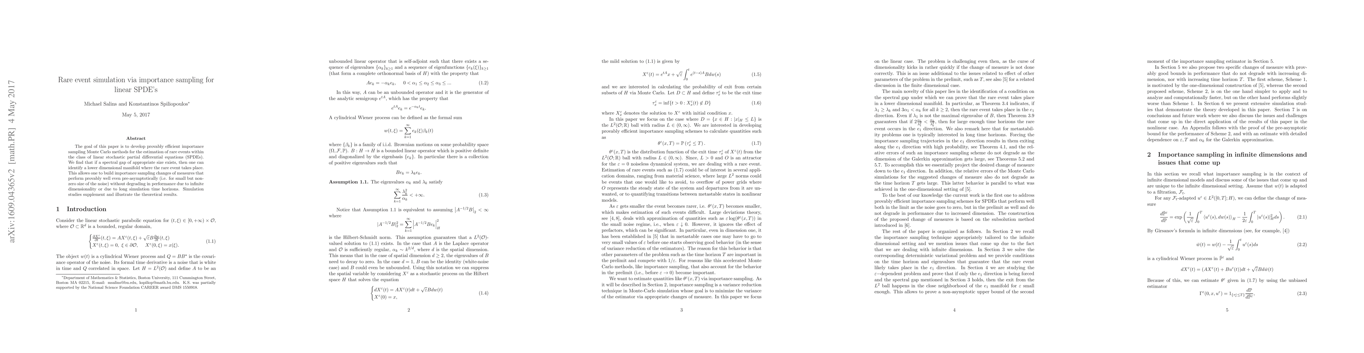 This paper develops efficient importance sampling Monte Carlo methods for estimating rare events in linear stochastic partial differential equations (SPDEs). It identifies a lower-dimensional manifold for rare events, enabling effective importance sampling changes of measures that perform well even for small noise sizes, without degradation due to dimensionality or long horizons.